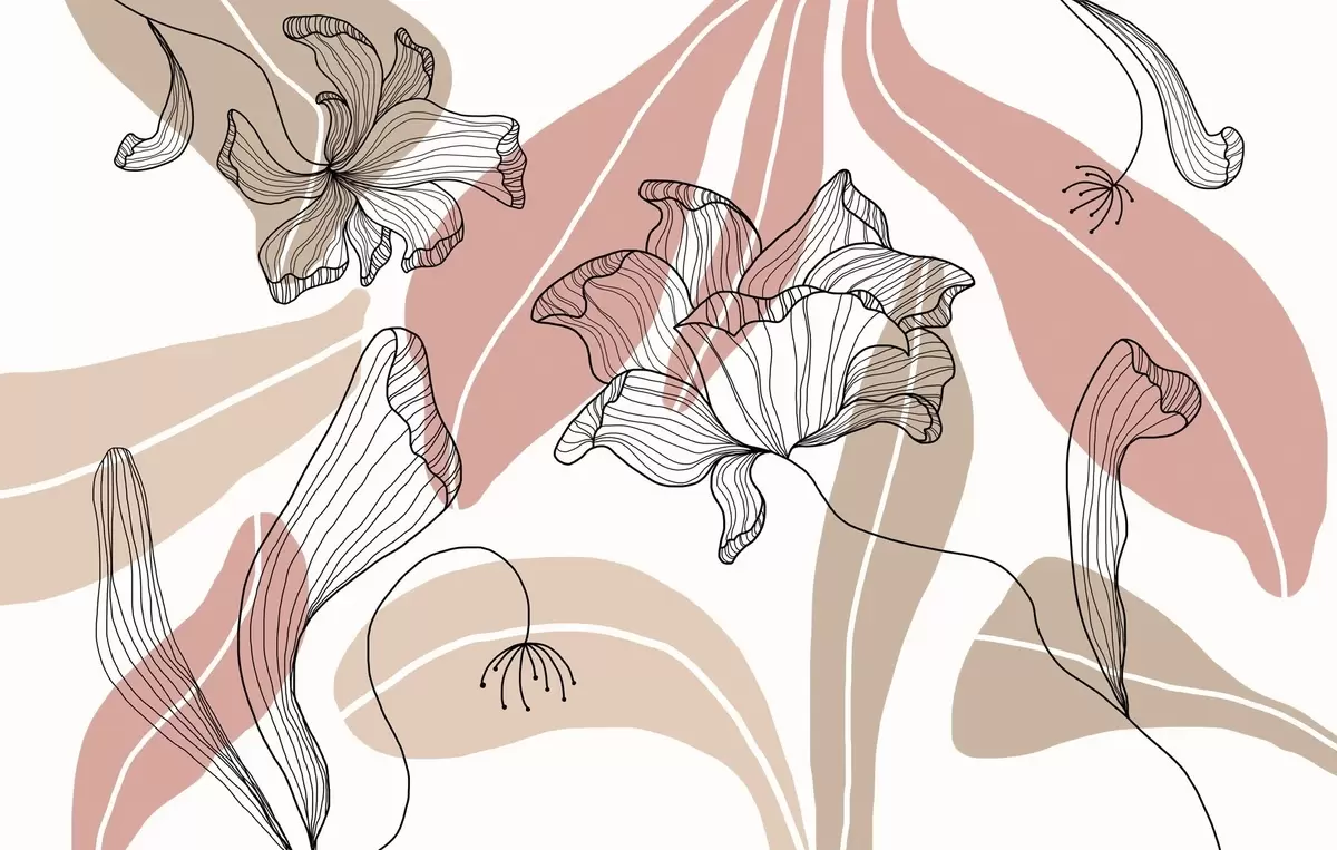 Papel de pared hojas y flores abstractas en tonos empolvados y beige Nr. w04499