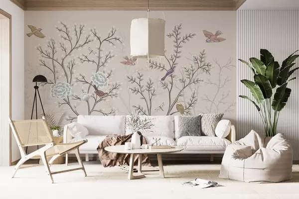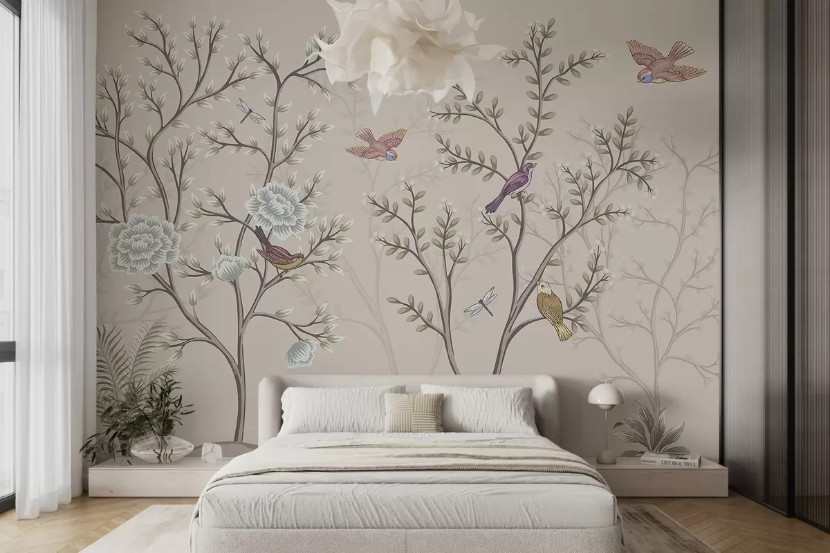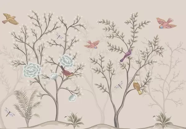 Papel de pared Árboles con pájaros y flores Nr. w04605