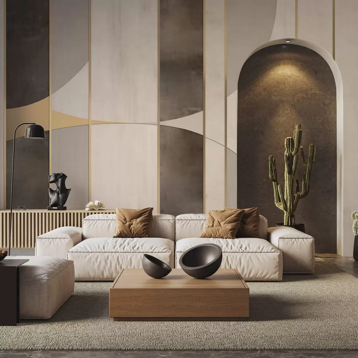 Papel de pared Paneles geométricos con arcos y detalles en color champán Nr. w04616