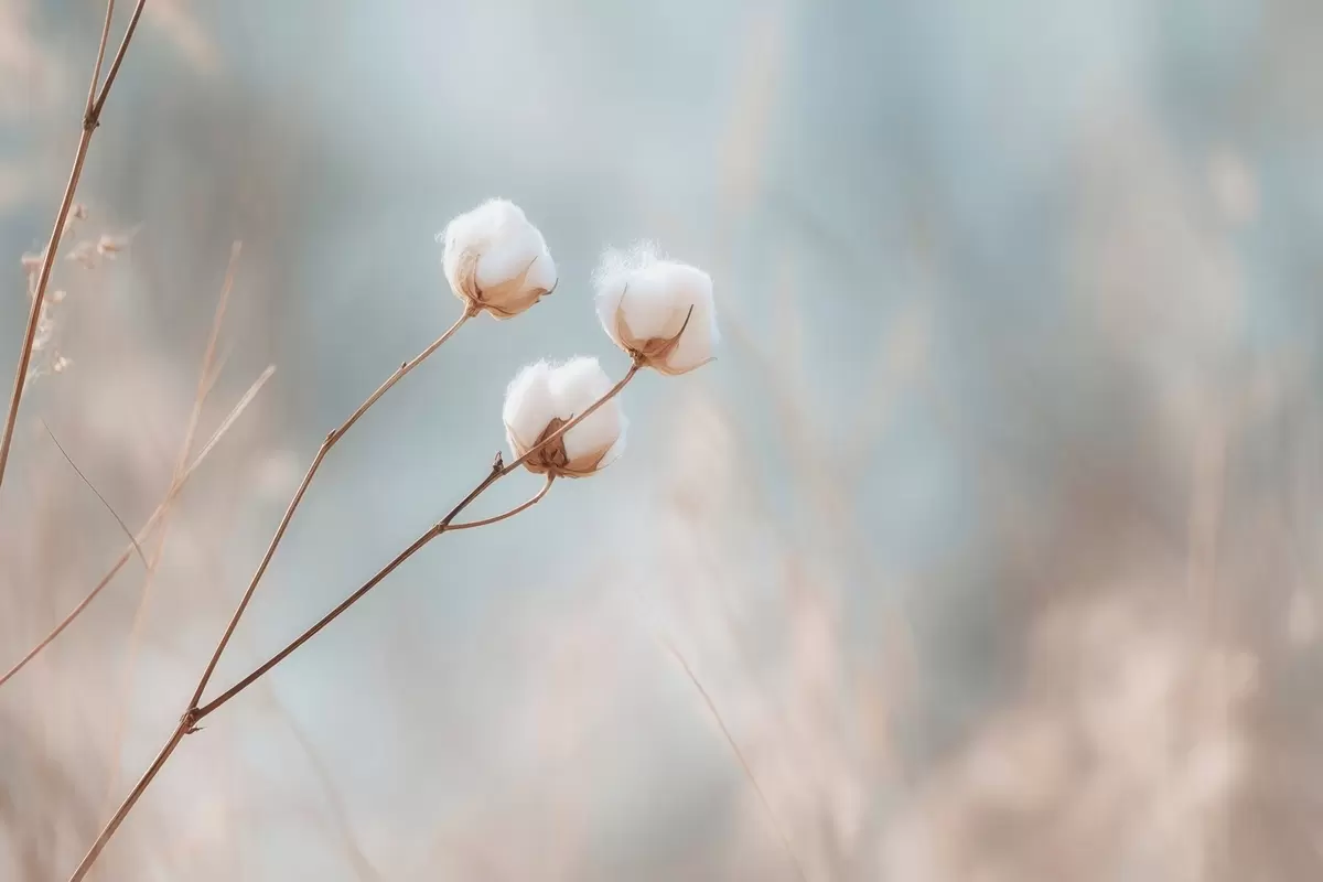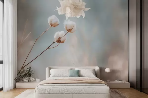 Papel de pared Tres flores de algodón sobre un fondo borroso. Nr. w04820