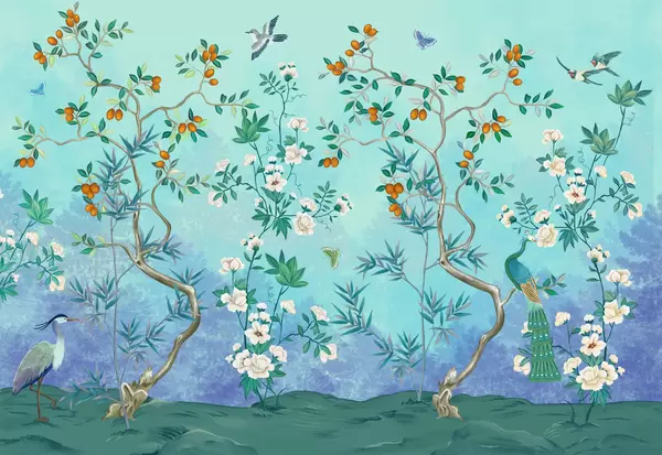 Papel de pared Escena decorativa con árboles, flores y pájaros sobre fondo oscuro. Nr. w05004