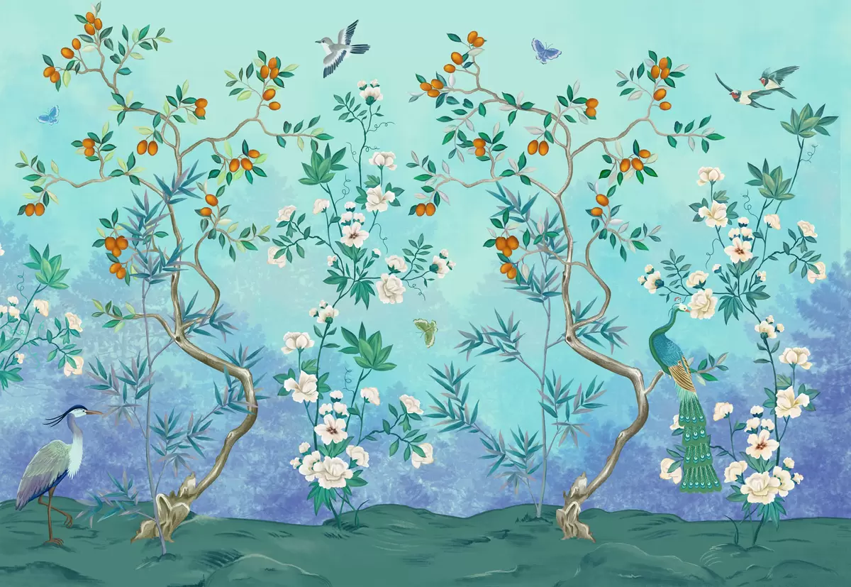 Papel de pared Escena con árboles, flores y pájaros, fondo azul Nr. w05004v2