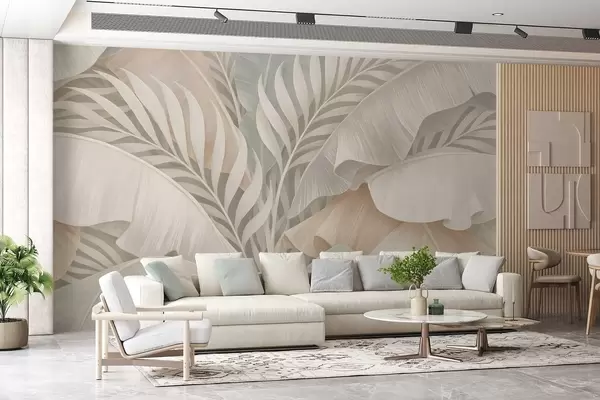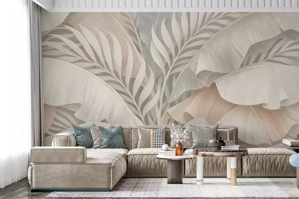 Papel de pared Grandes hojas tropicales en tonos melocotón y turquesa apagado. Nr. w05062