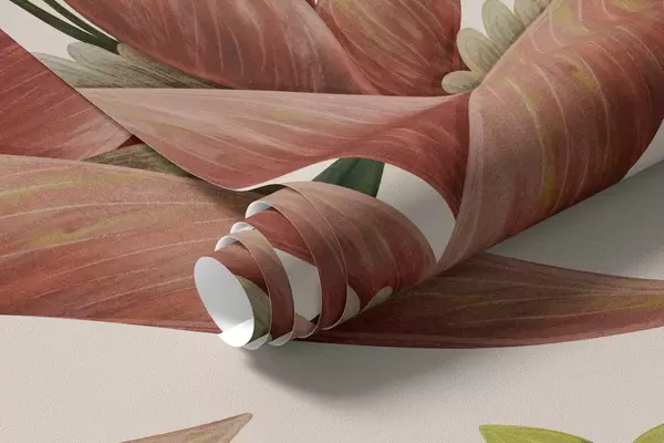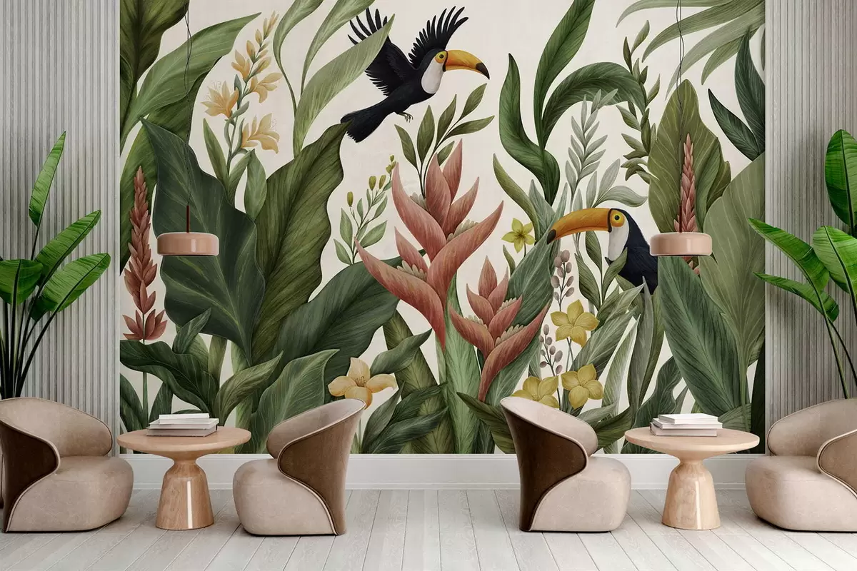 Papel de pared Plantas tropicales y aves de pico grande sobre fondo claro Nr. w05088v1