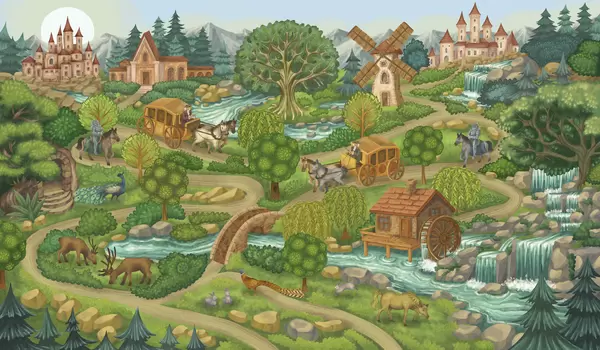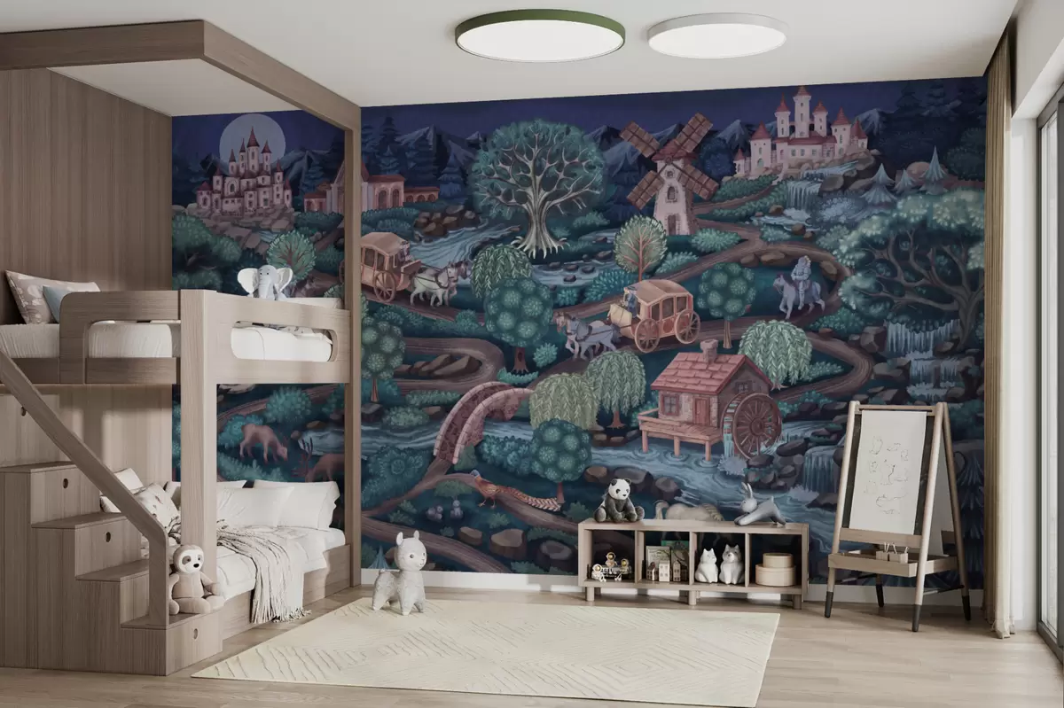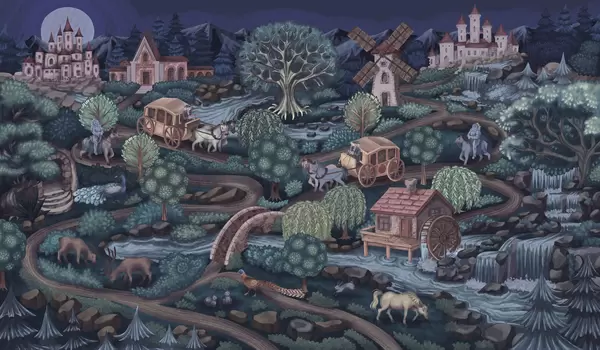 Papel de pared Escena nocturna con castillos, molinos y bosques Nr. w05091