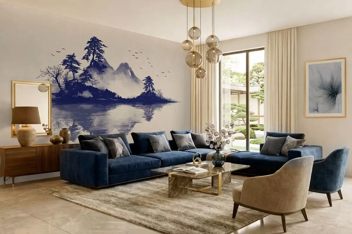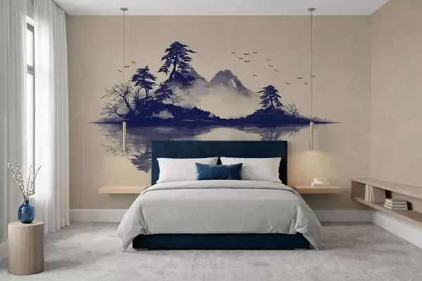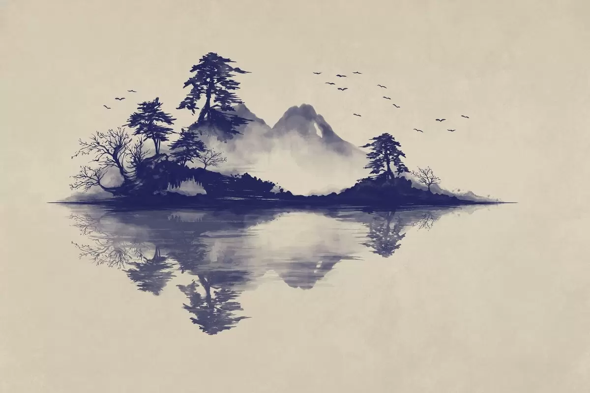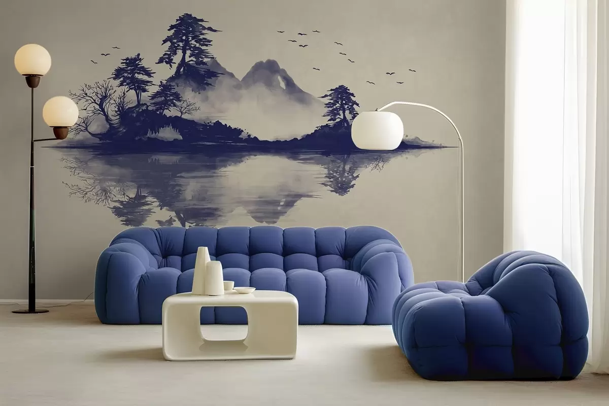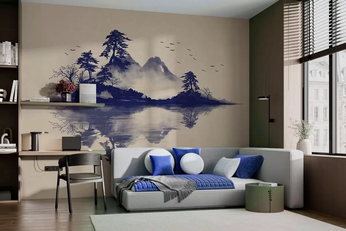 Papel de pared Paisaje montañoso en sumi-e en tonos azules Nr. w05124v2