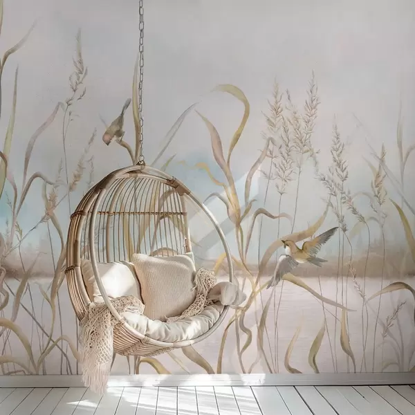 Papel de pared Ilustración de juncos y pájaros junto al agua en tonos suaves. Nr. w05125