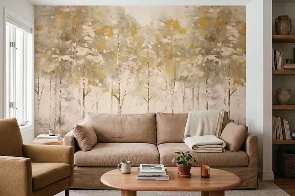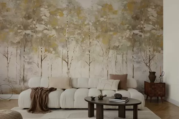 Papel de pared Bosque estilizado con árboles esbeltos en tonos cálidos. Nr. w05221