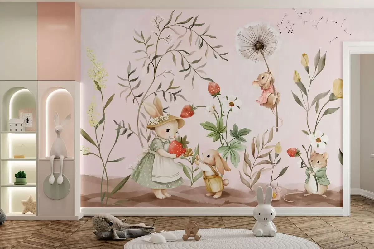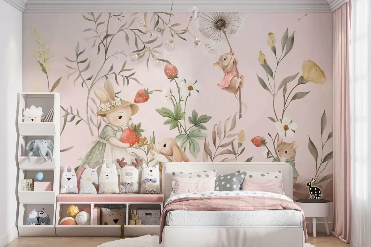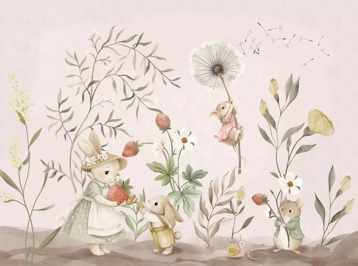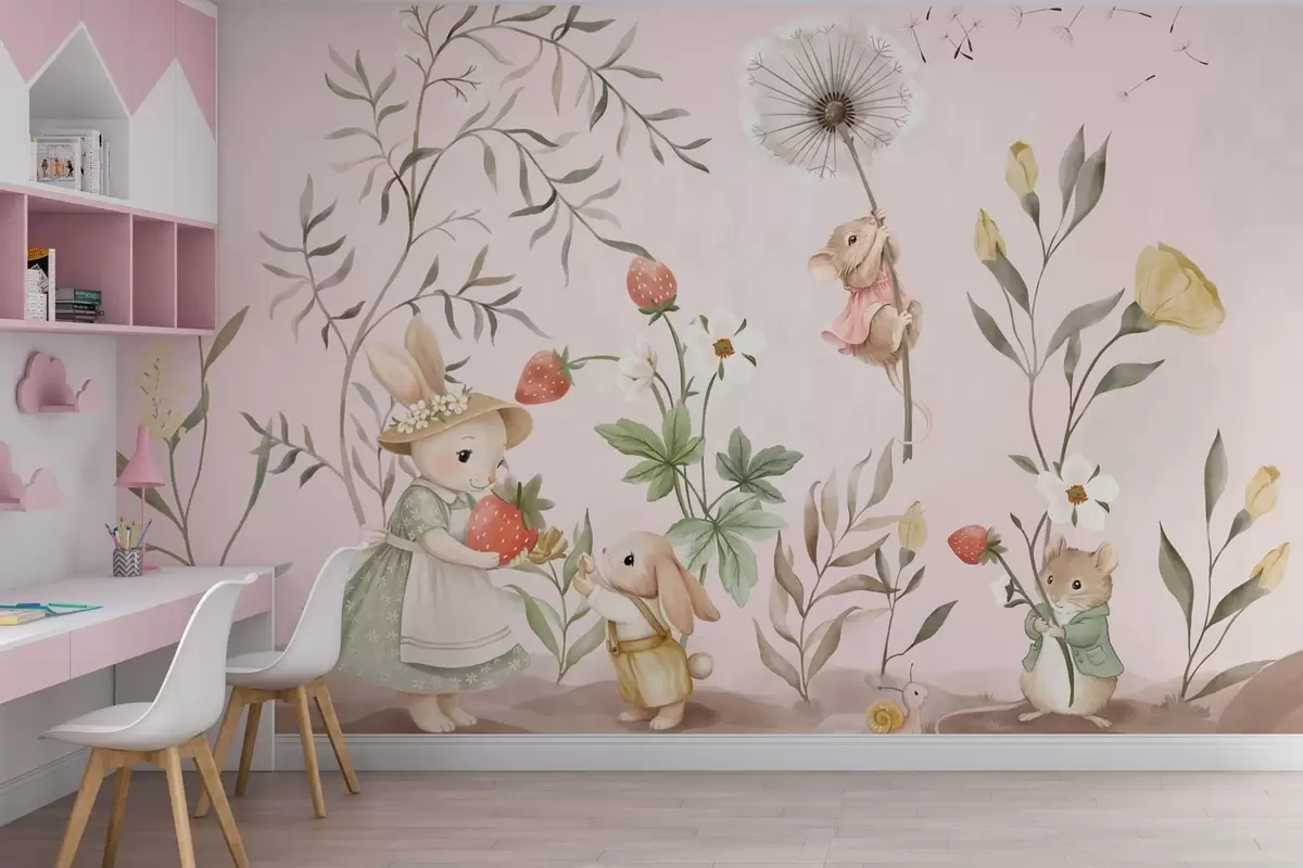 Papel de pared Ilustración de animales con fresas sobre un fondo rosa claro Nr. w05422v1
