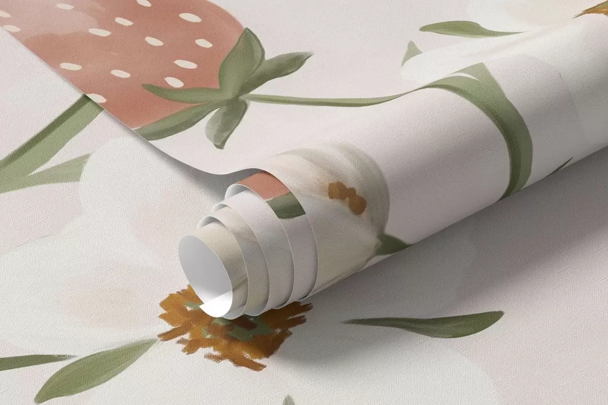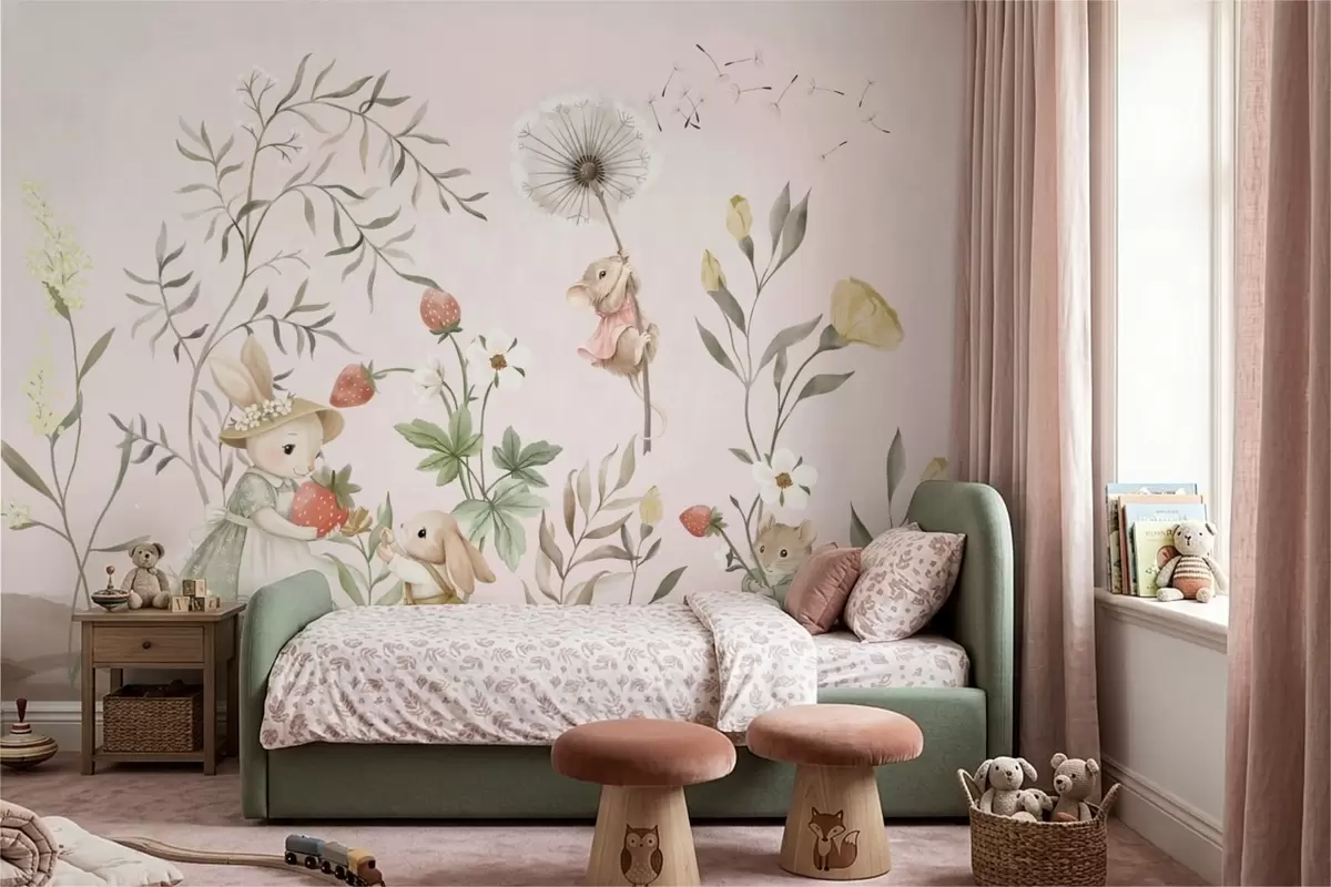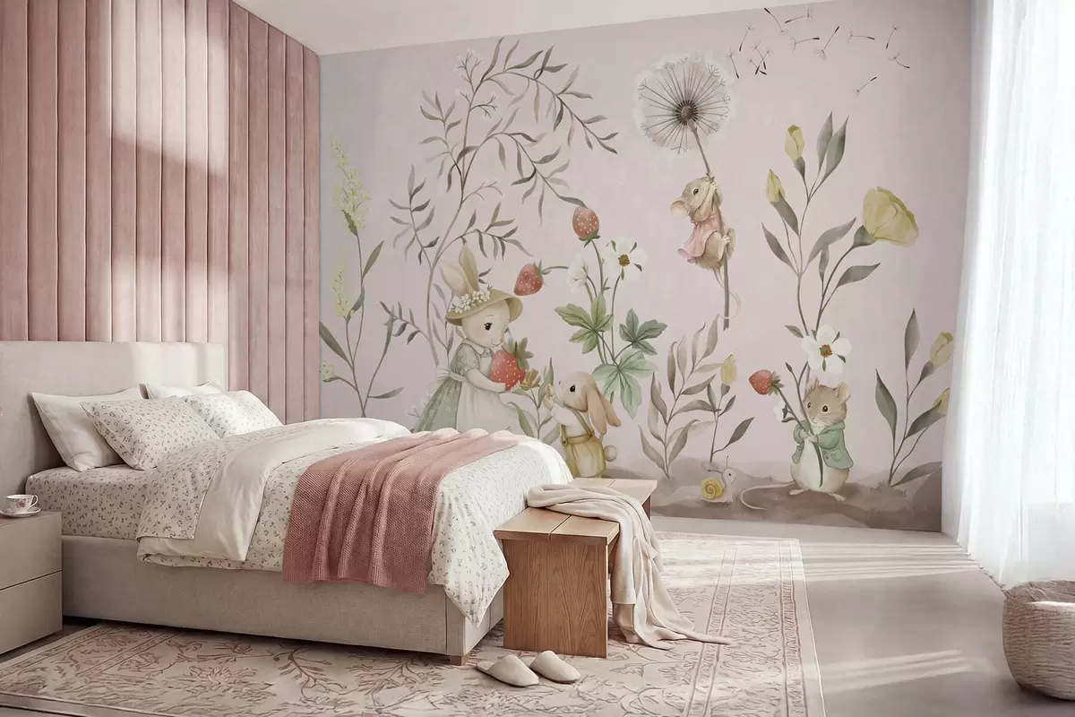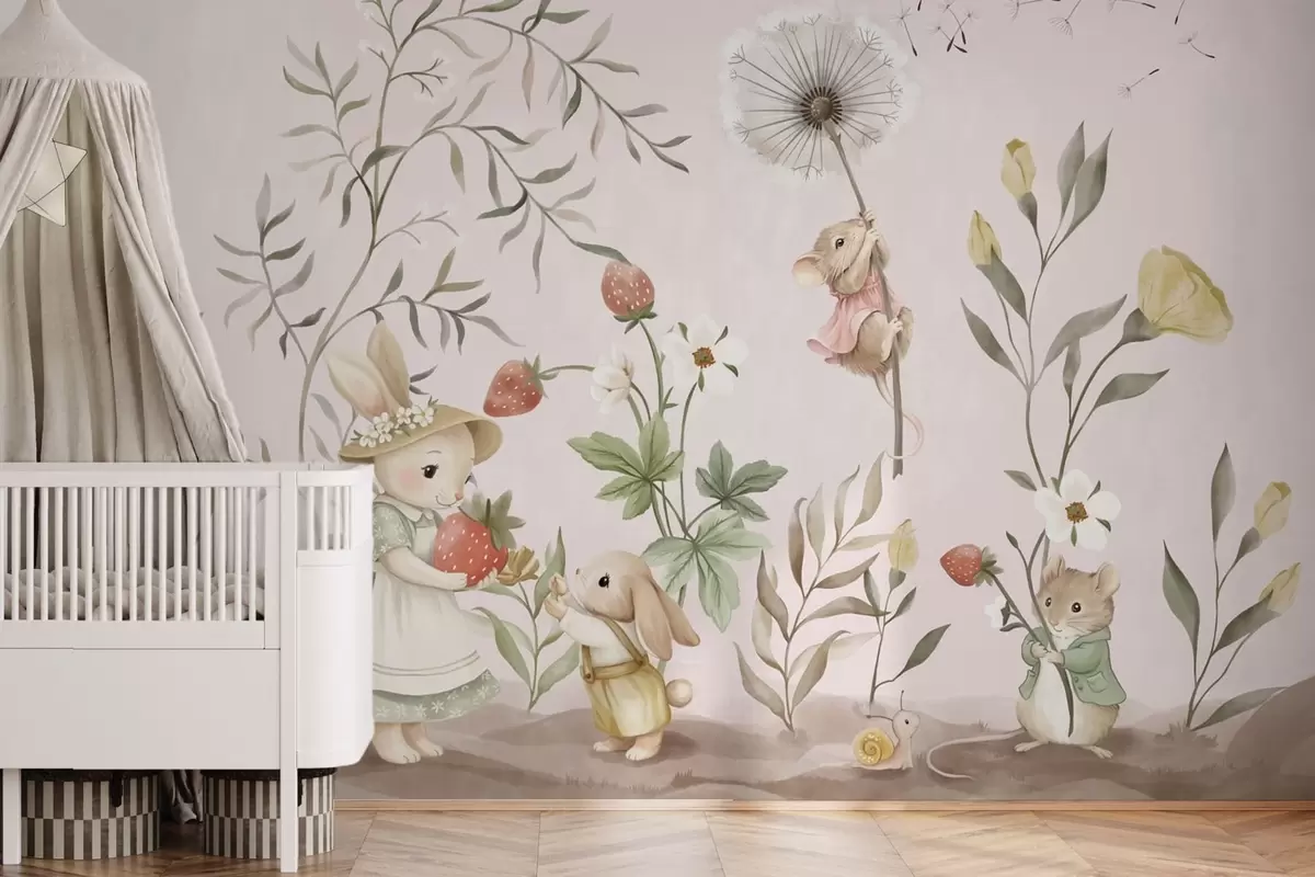 Papel de pared Ilustración de animales con fresas sobre un fondo rosa claro Nr. w05422v1