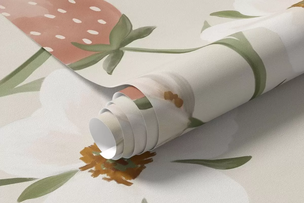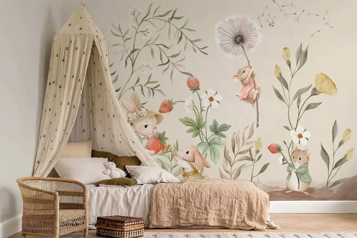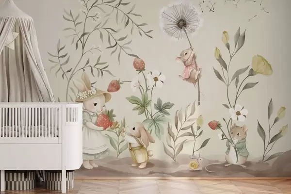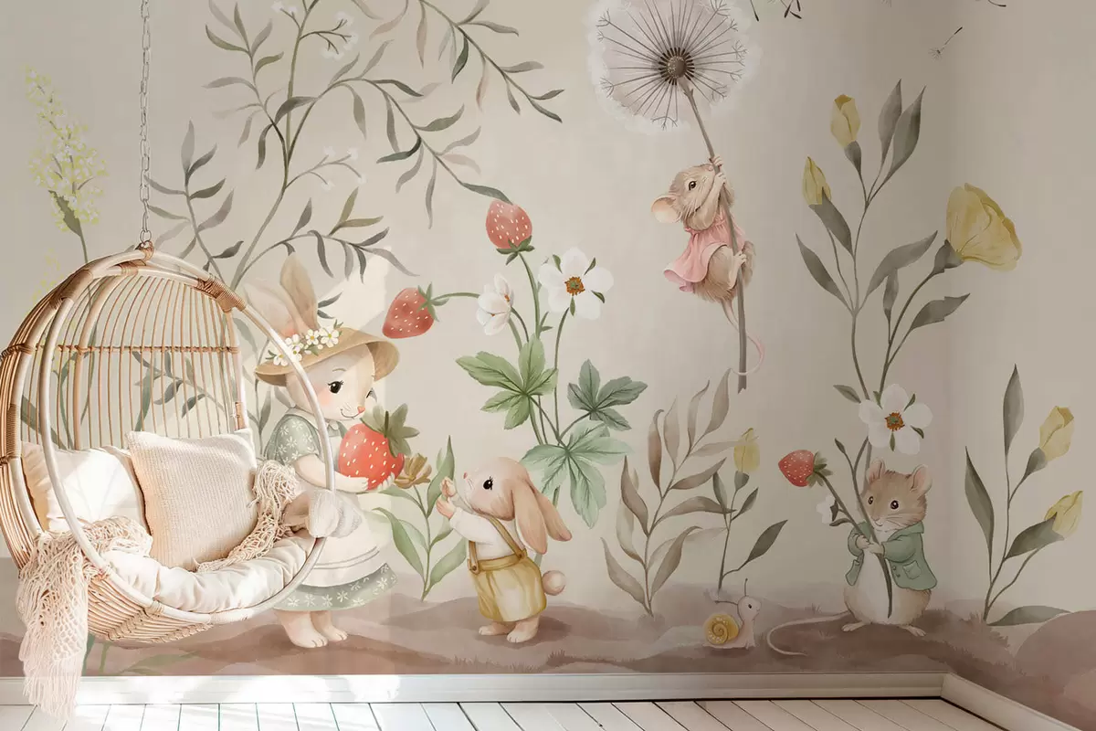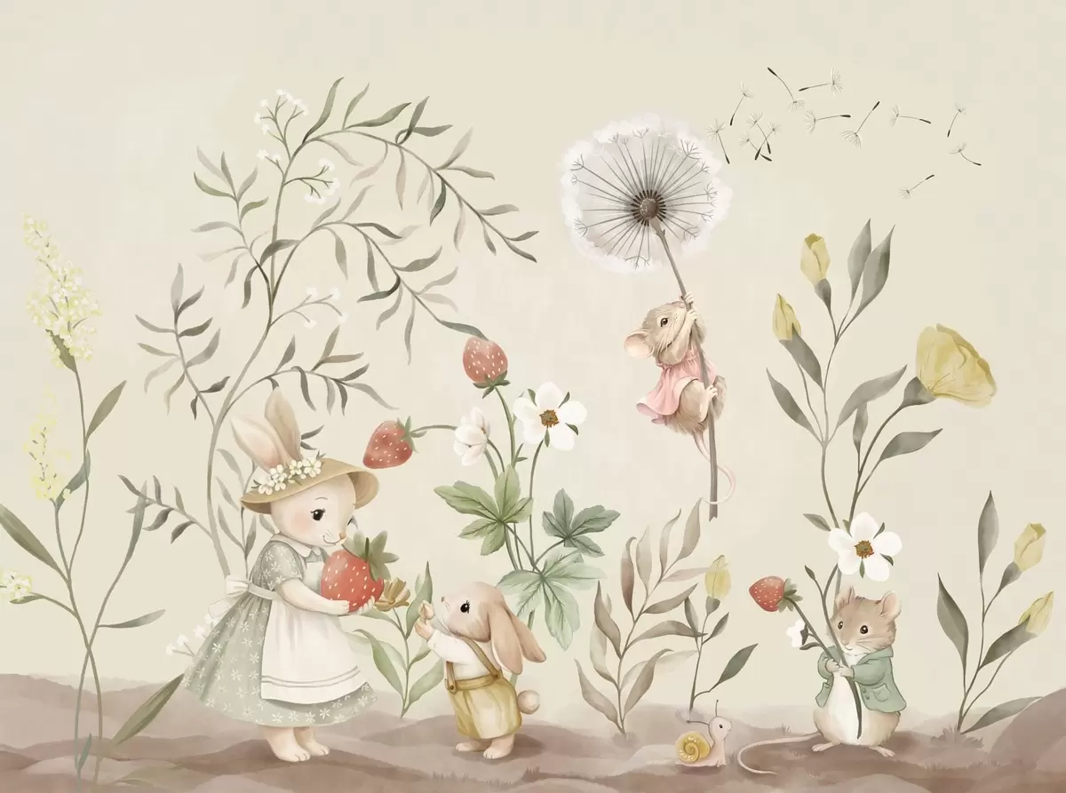 Papel de pared Ilustración de un conejito, un ratón y unas plantas con fresas Nr. w05422v2