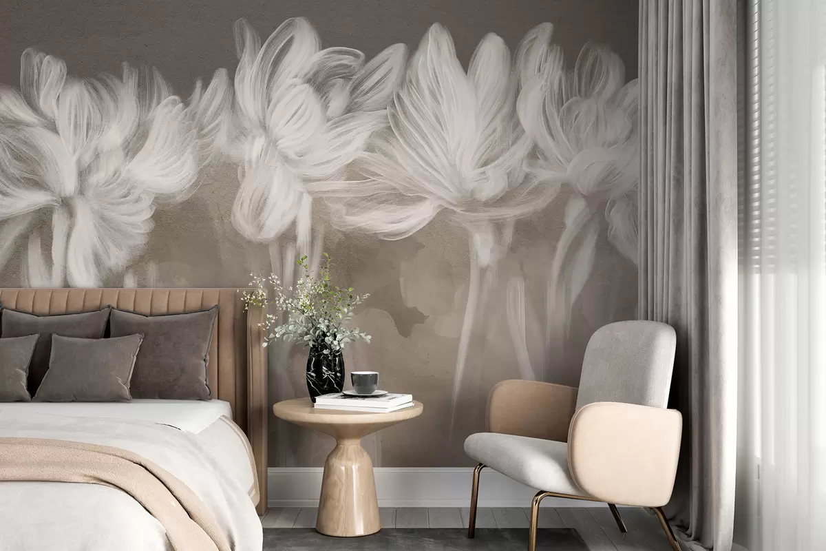 Papel de pared Suave minimalismo siluetas florales blancas transparentes sobre fondo de textura marrón Nr. w07986