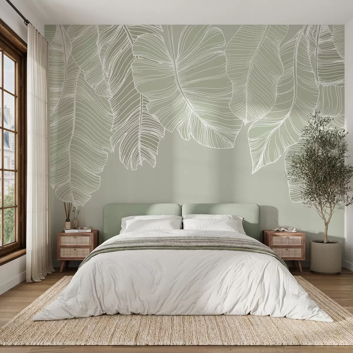 Papel de pared Hojas florales tropicales blancas con fondo verde claro, diseño de arte lineal minimalista. Nr. w08235v1