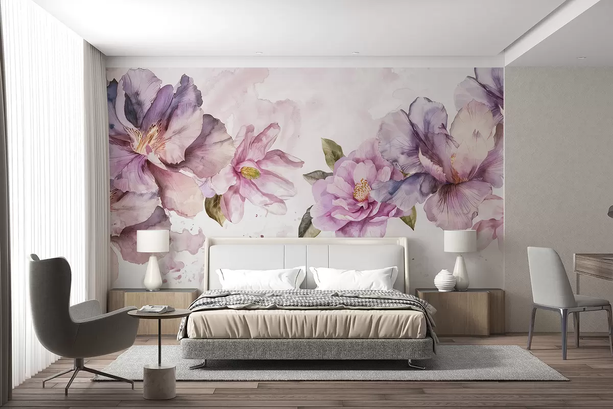 Papel de pared Delicadas flores de acuarela de color rosa y morado con pétalos suaves y hojas verdes sobre un fondo claro. Nr. w08238