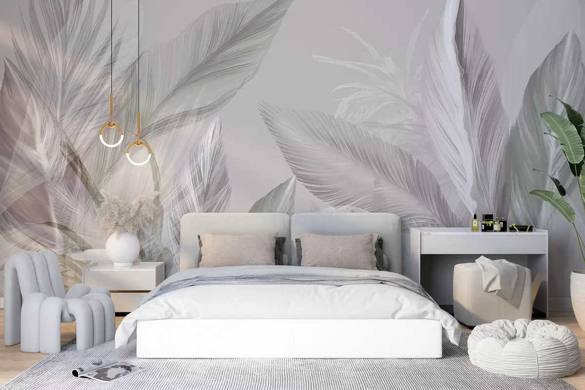Papel de pared Plumas suaves de color blanco, rosa y gris y hojas tropicales flotando sobre un fondo claro. Nr. w08241v1
