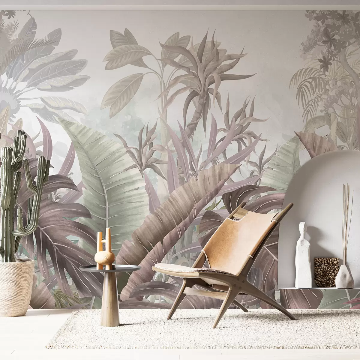 Papel de pared Una jungla tropical con grandes hojas de palmera y plantas exóticas en tonos grises, blancos y beige Nr. w08307