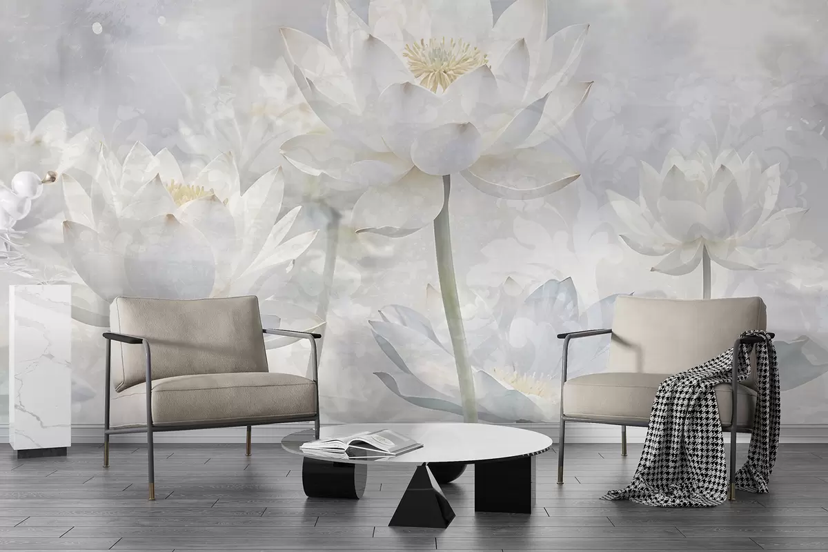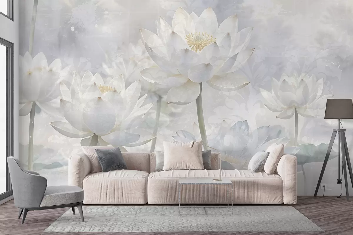 Papel de pared Flores de loto blancas en un etéreo fondo de paisaje abstracto en colores pastel Nr. w08328