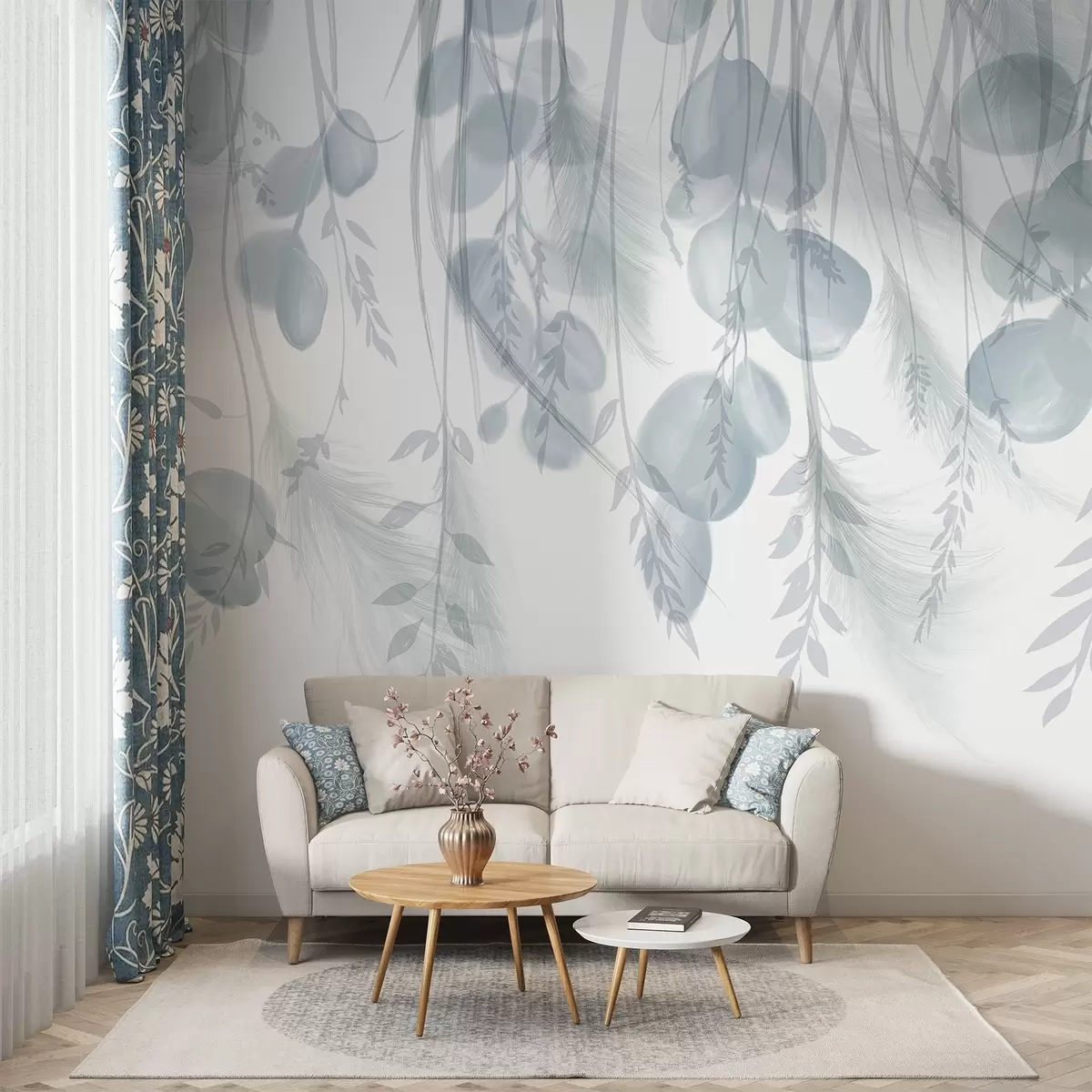 Papel de pared Delicadas hojas de eucalipto grises y verde pastel cayendo, creando una atmósfera serena y tranquilizadora Nr. w08380