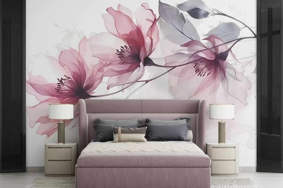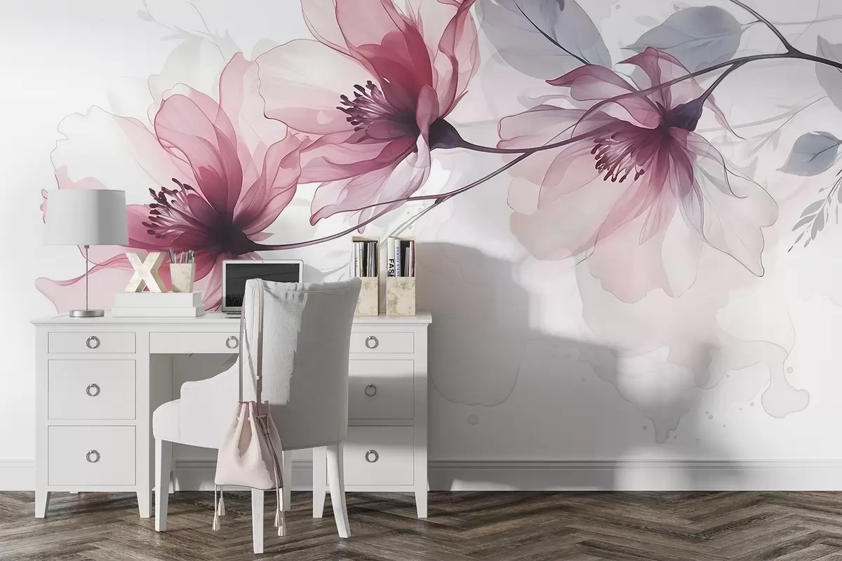 Papel de pared Delicadas flores transparentes rosas y grises con pétalos suaves y difuminados sobre fondo blanco Nr. w08429