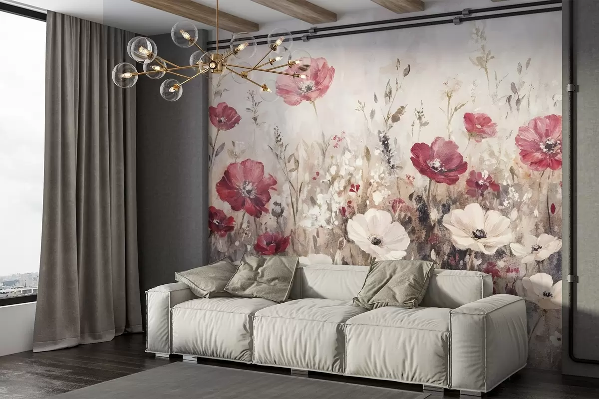 Papel de pared Un campo de vibrantes flores rojas y blancas sobre un fondo suave y brumoso en estilo de pintura al óleo Nr. w08438