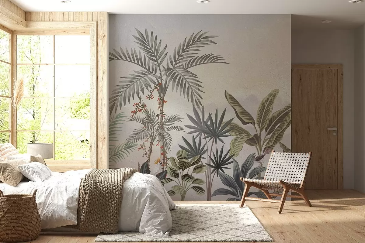 Papel de pared Selva tropical con palmeras y pájaros de colores Nr. w08496