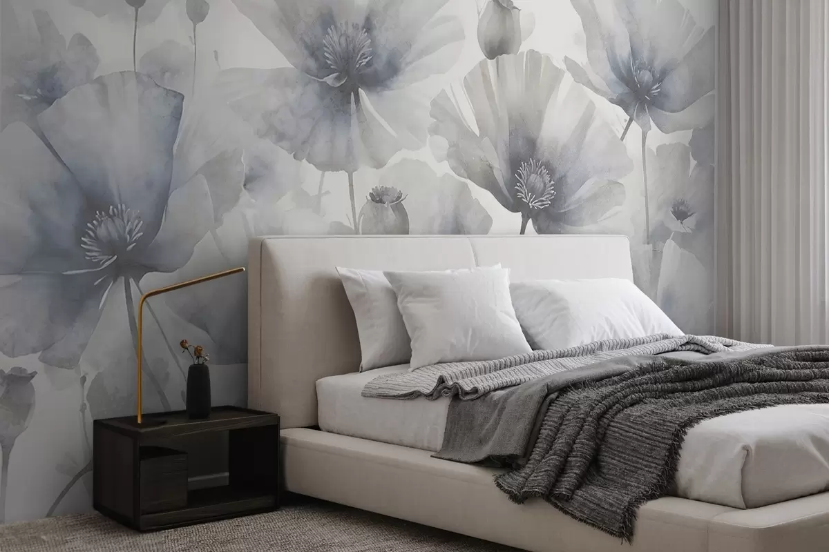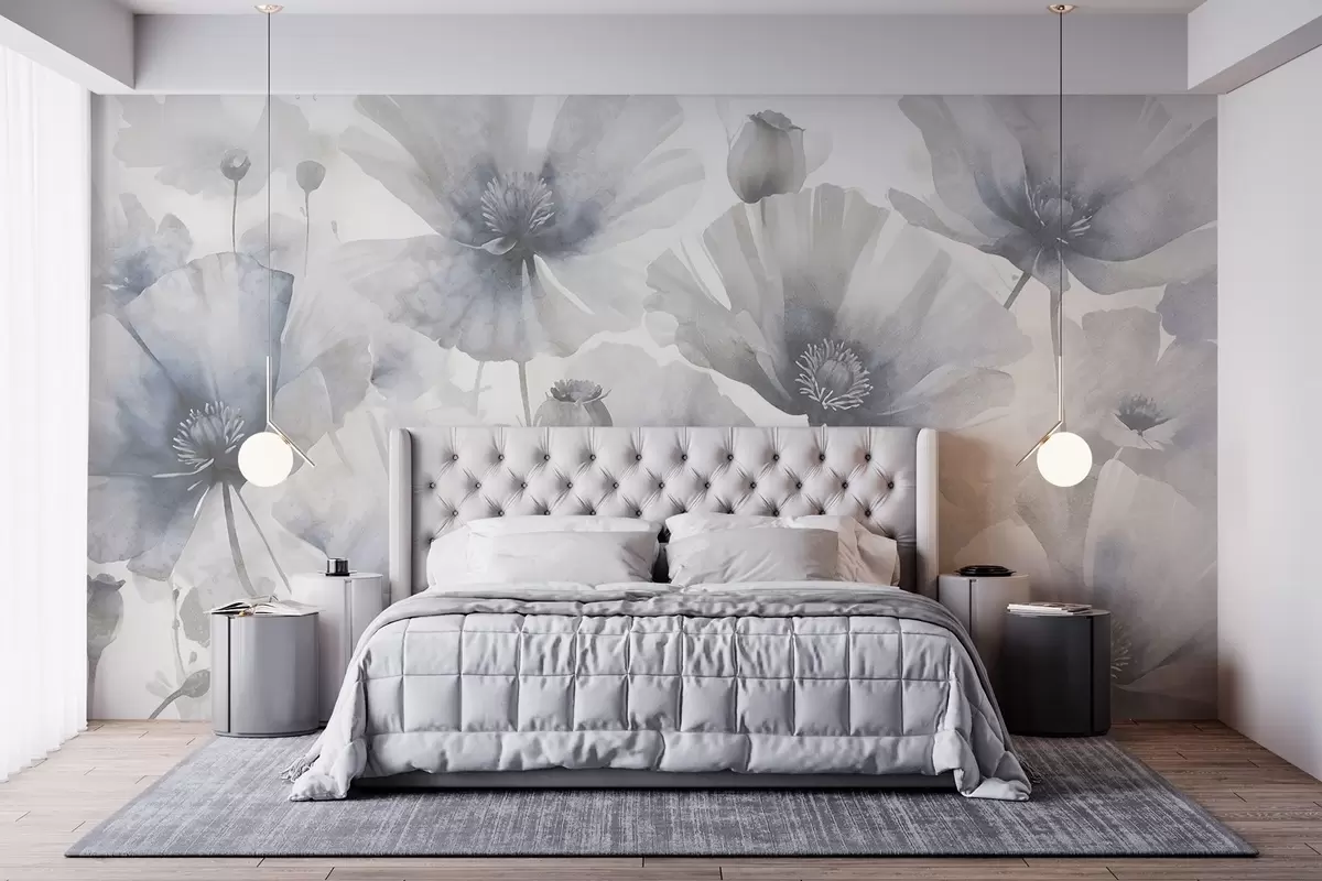 Papel de pared Delicadas flores grunge grises y blancas con pétalos suaves y difuminados sobre fondo blanco Nr. w08526