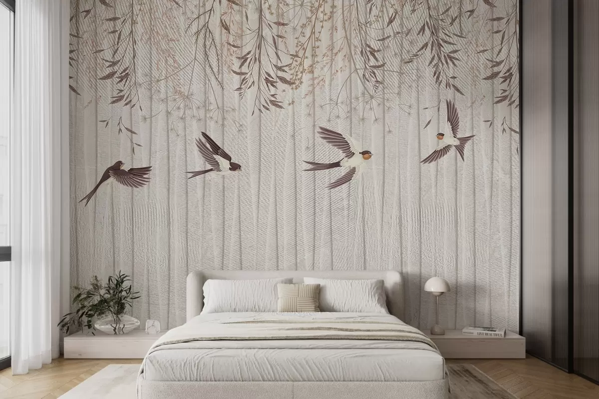 Papel de pared Pájaros volando sobre un fondo texturizado con dientes de león y flores Nr. w08566