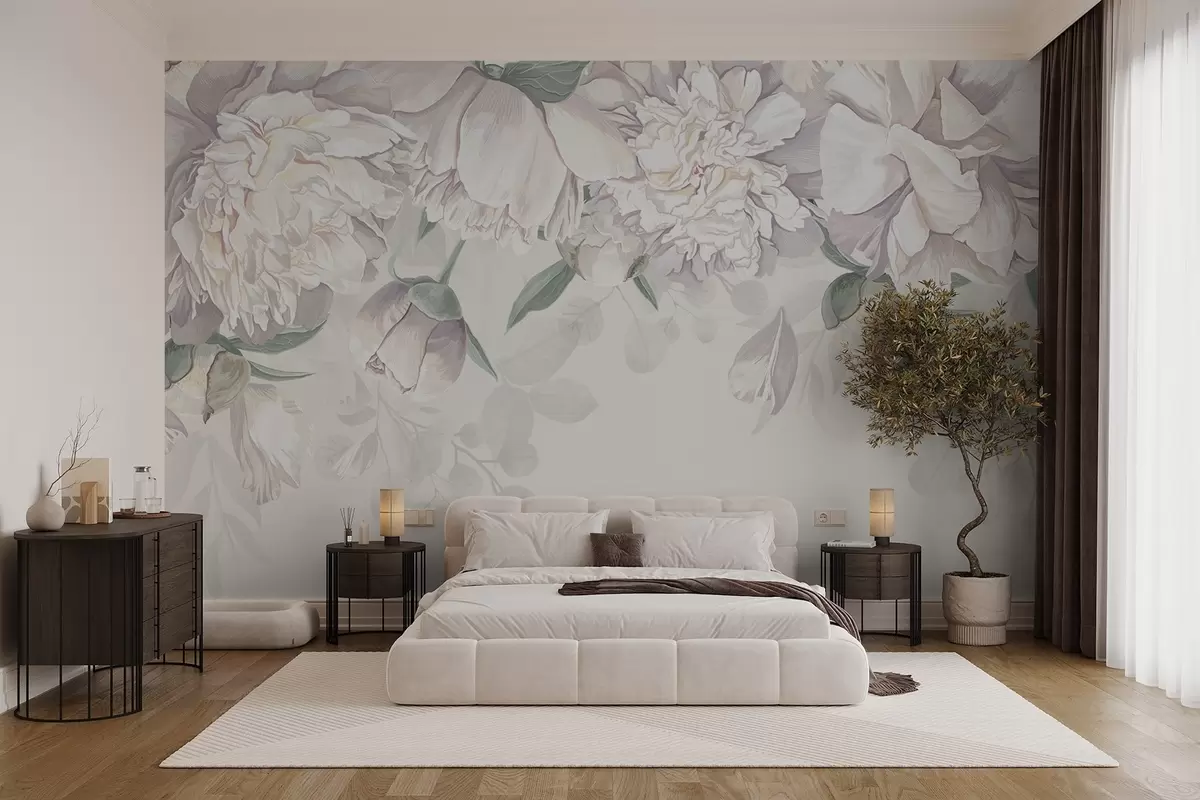Papel de pared Delicadas peonías blancas y rosas pastel con hojas verdes, dispuestas en un suave y romántico fondo floral Nr. w08577