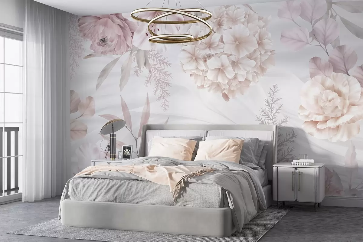 Papel de pared Un estampado floral suave y abstracto con grandes flores rosas y blancas, delicadas hojas y una paleta de colores pastel apagados Nr. w08651