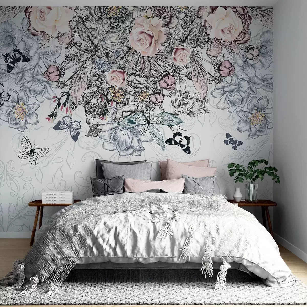 Papel de pared Un dibujo floral con rosas rosadas y varias flores y mariposas con intrincado arte lineal sobre fondo texturizado Nr. w08674