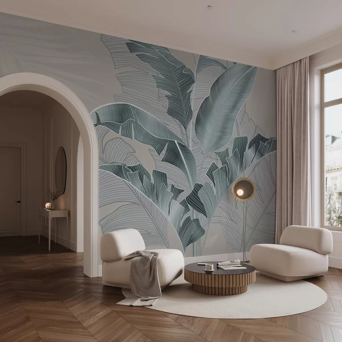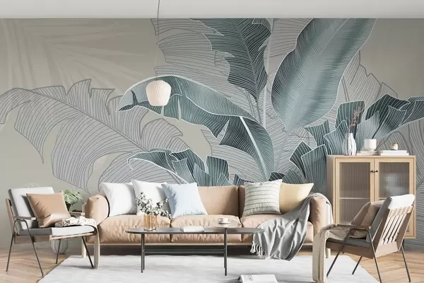Papel de pared Una armoniosa composición de hojas tropicales en tonos beige y turquesa, con un detallado trabajo de líneas Nr. w08698v1