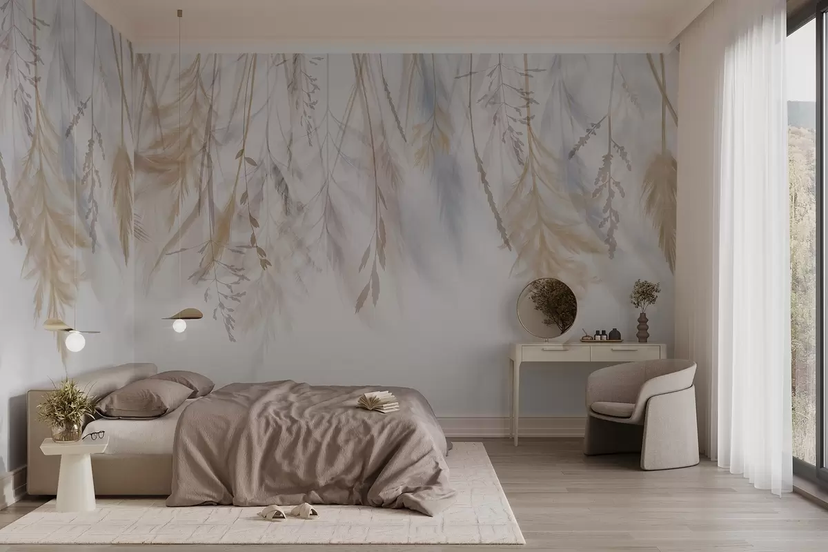 Papel de pared Delicadas hierbas, espiguillas y plantas en tonos pastel, dispuestas en un estampado en cascada sobre un fondo pálido Nr. w08737
