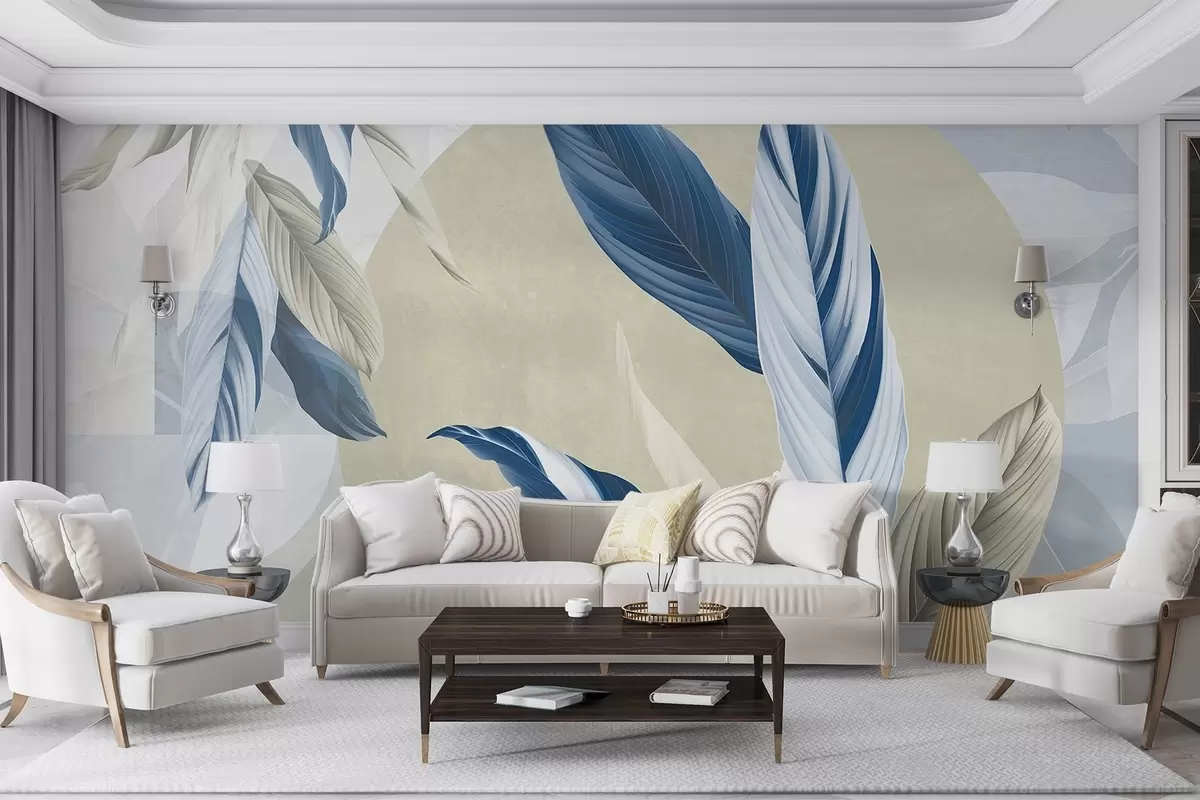 Papel de pared Composición geométrica texturada moderna y abstracta con hojas detalladas en tonos azul, beige y blanco Nr. w08741