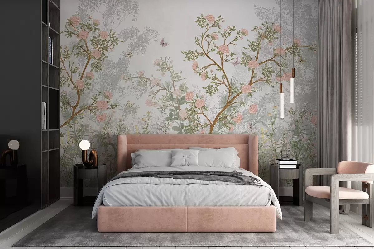 Papel de pared Delicados árboles en flor de color rosa, mariposas voladoras y hojas verdes entrelazadas con esbeltas ramas Nr. w08744