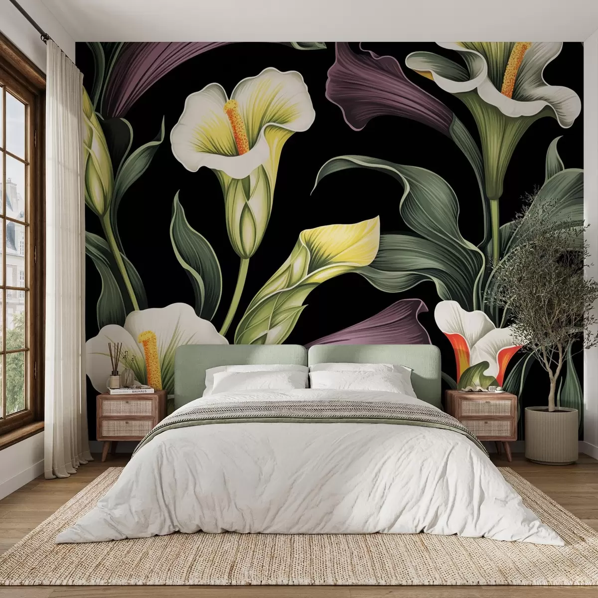 Papel de pared Calas blancas, verdes y moradas sobre fondo negro Nr. w08752