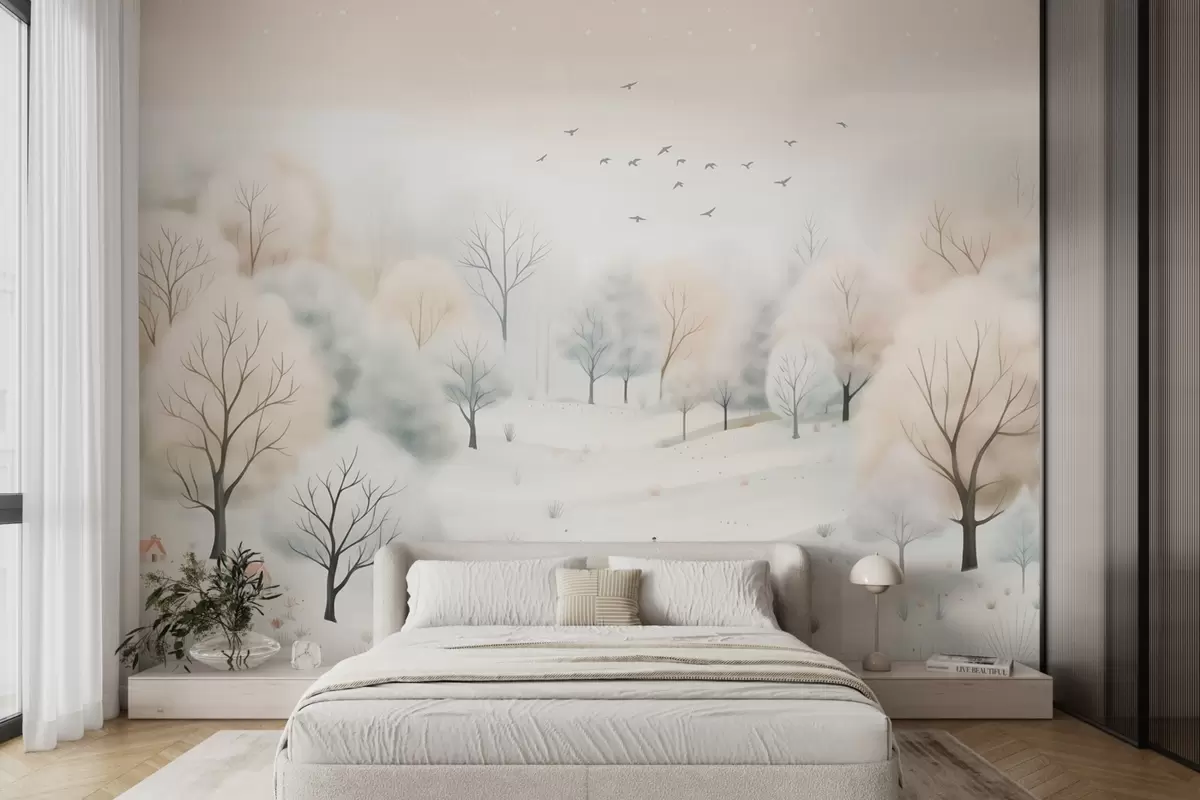 Papel de pared Bosque invernal con árboles, casitas, pájaros y nieve en estilo acuarela ligera Nr. w08815