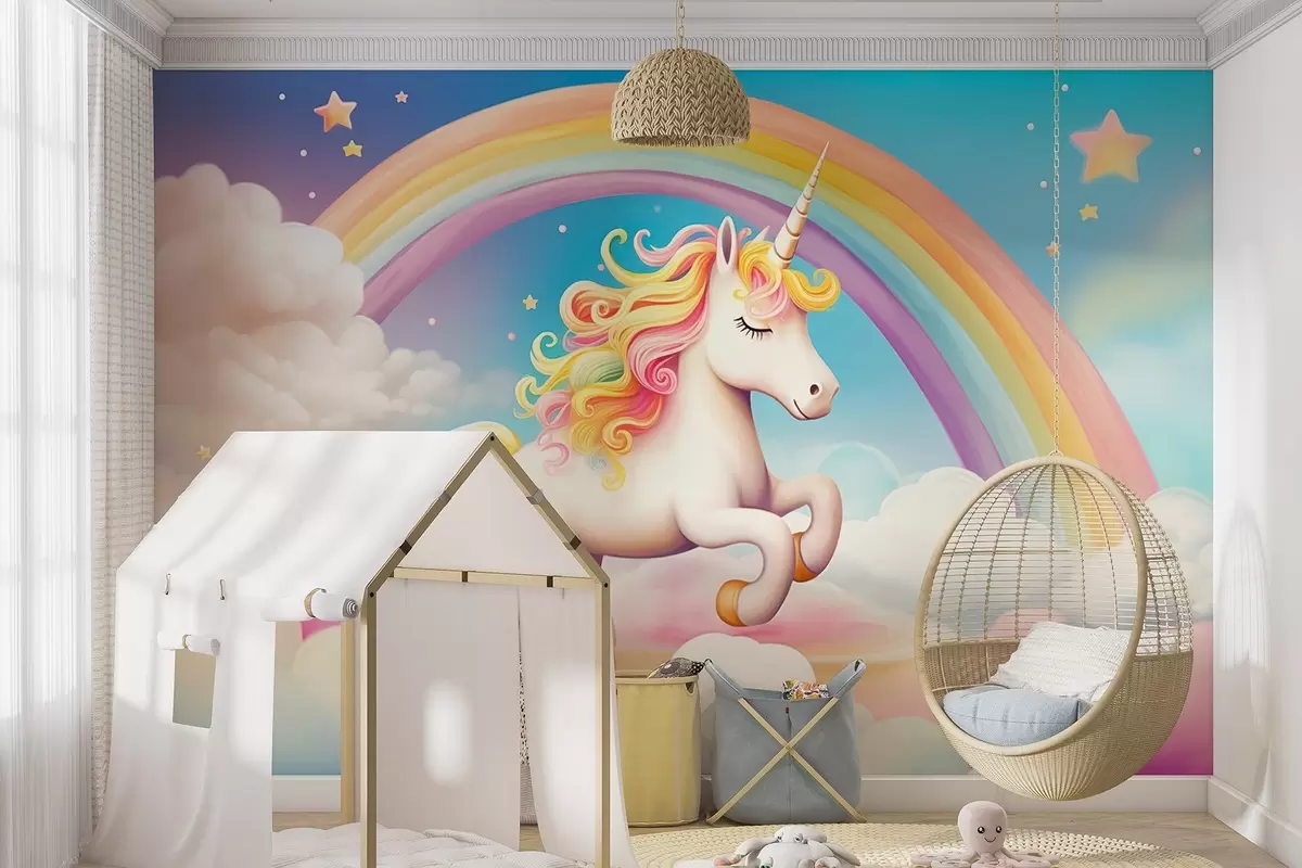 Papel de pared Un caballo unicornio con un arco iris, nubes y un cielo estrellado Nr. w08820