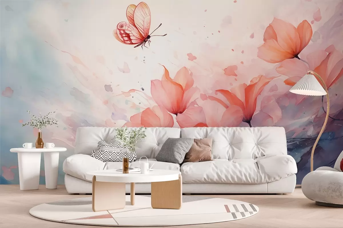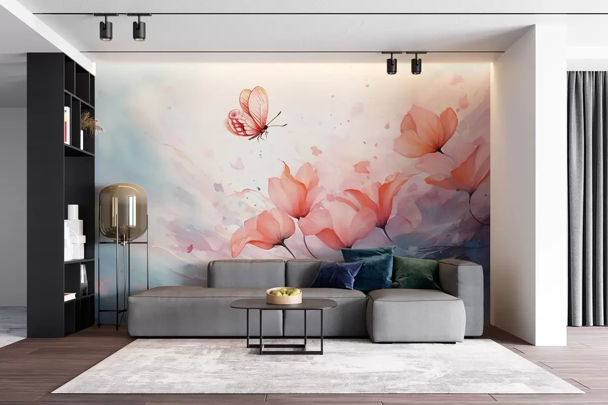 Papel de pared Delicadas amapolas con una mariposa en estilo acuarela Nr. w08849