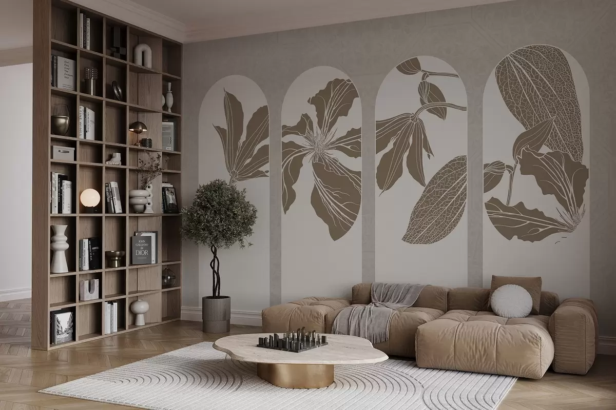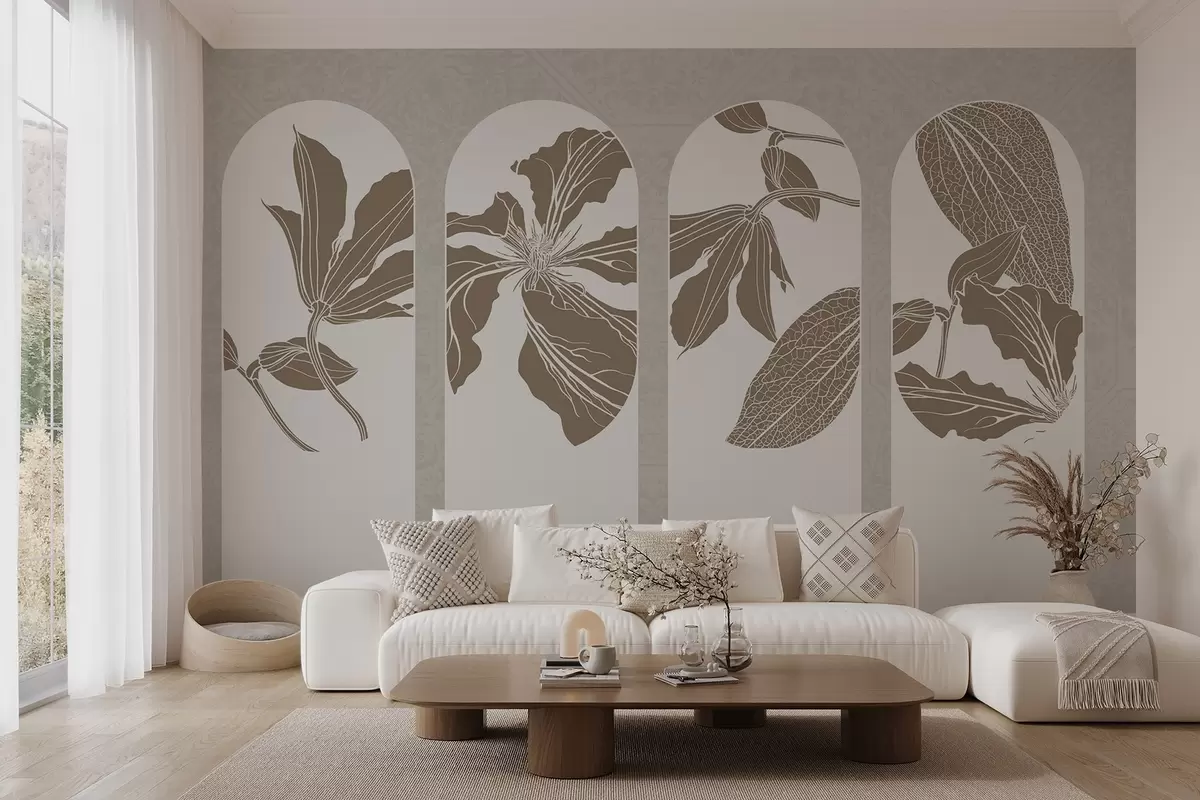 Papel de pared Elegantes arcos con diseños florales en beige y blanco, sobre fondo beige texturado, estilo minimalista Nr. w08866