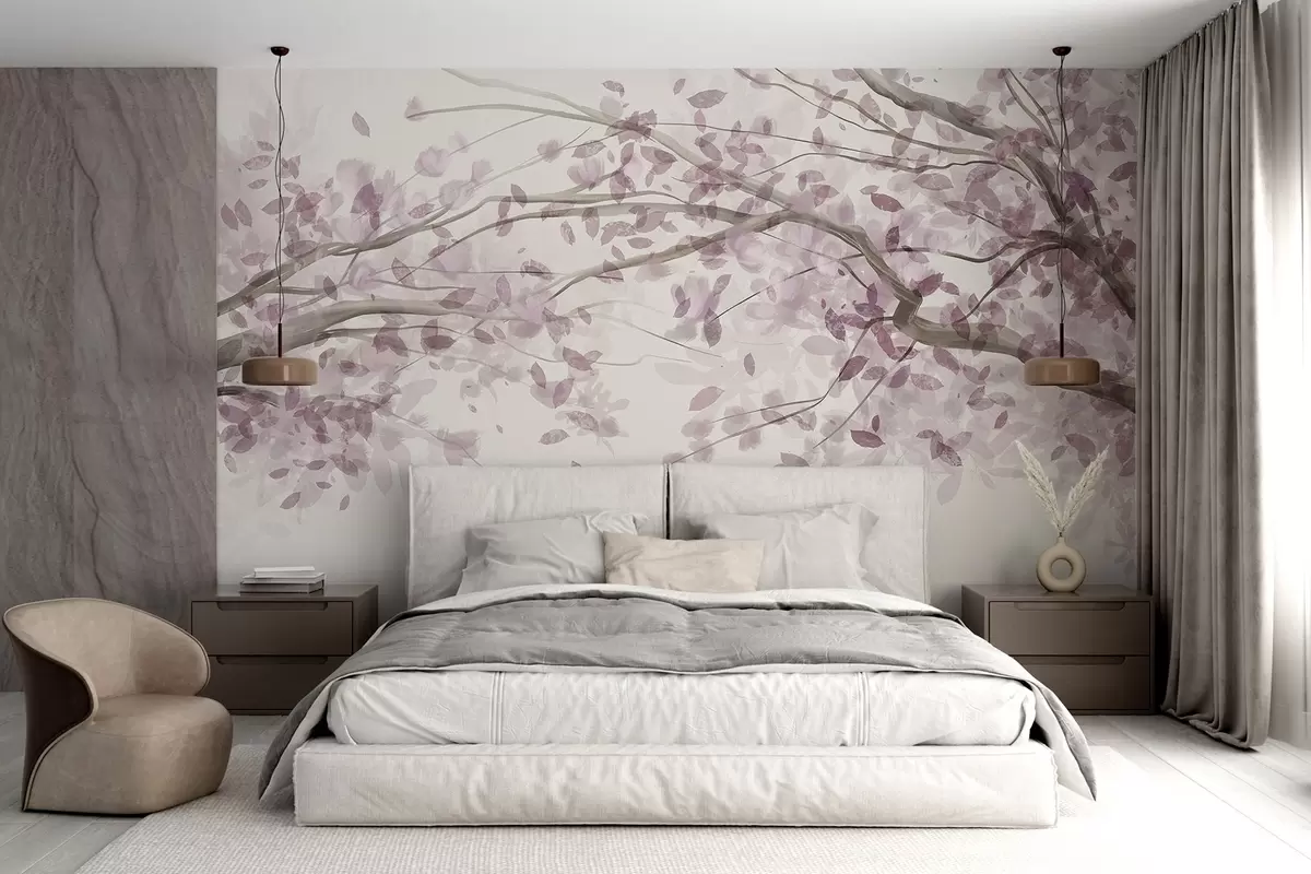 Papel de pared Ramas en flor con hojas rosas, colores suaves, detalles delicados, estilo acuarela, sobre fondo claro Nr. w08867