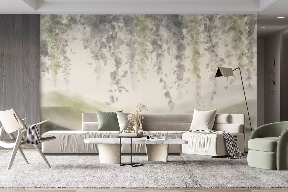 Papel de pared Hojas de glicina colgando sobre montañas azuladas, suaves colores pastel verde y beige, paisaje estilo acuarela Nr. w08909v2