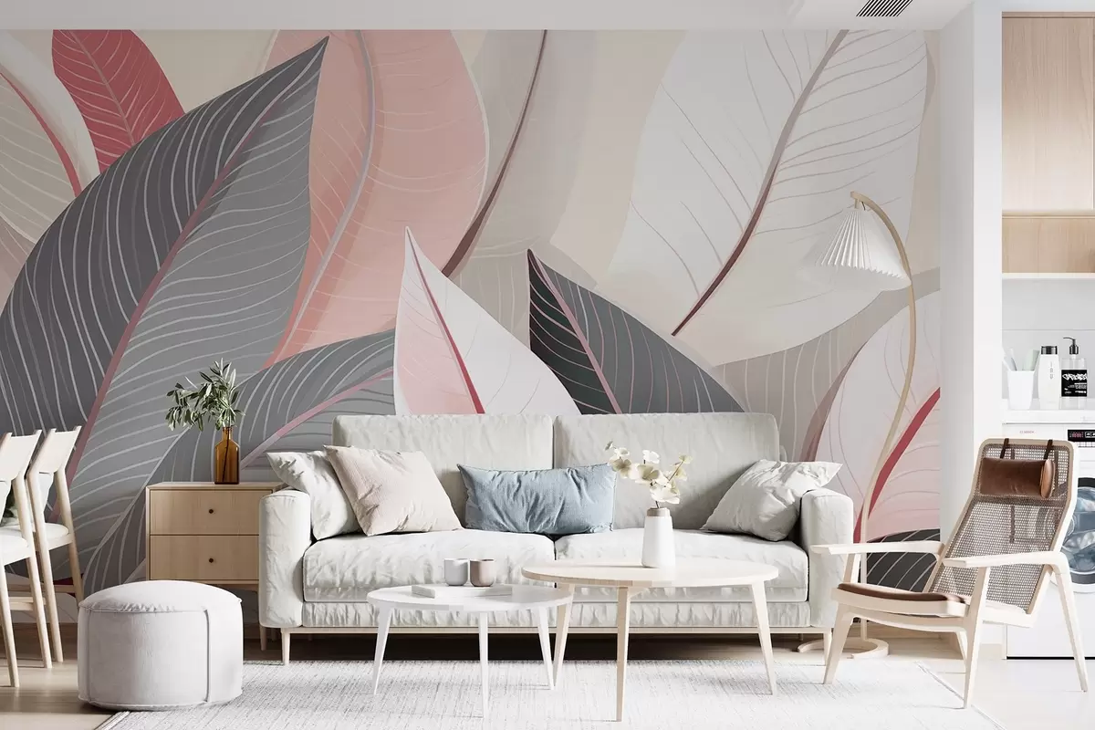 Papel de pared Primer plano de hojas en tonos grises y rosas Nr. w08944v1