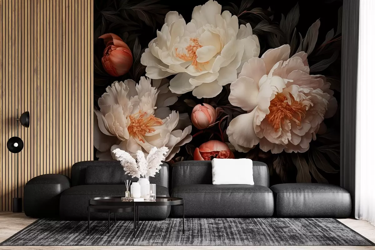 Papel de pared Grandes peonías blancas con capullos rojos sobre fondo oscuro Nr. w08965