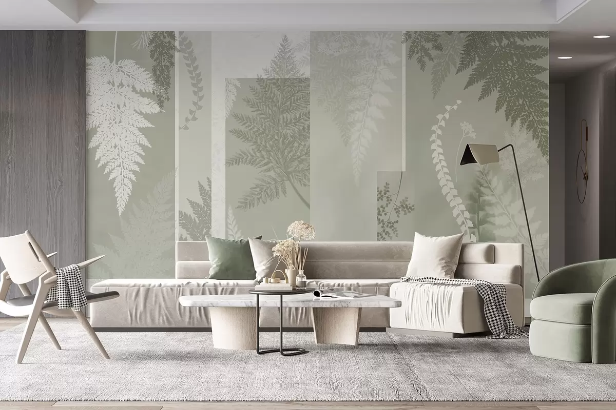 Papel de pared Hojas de helecho en verde y blanco, dispuestas en rayas verticales, creando un estampado botánico y minimalista, de colores suaves y apagados Nr. w09007v2