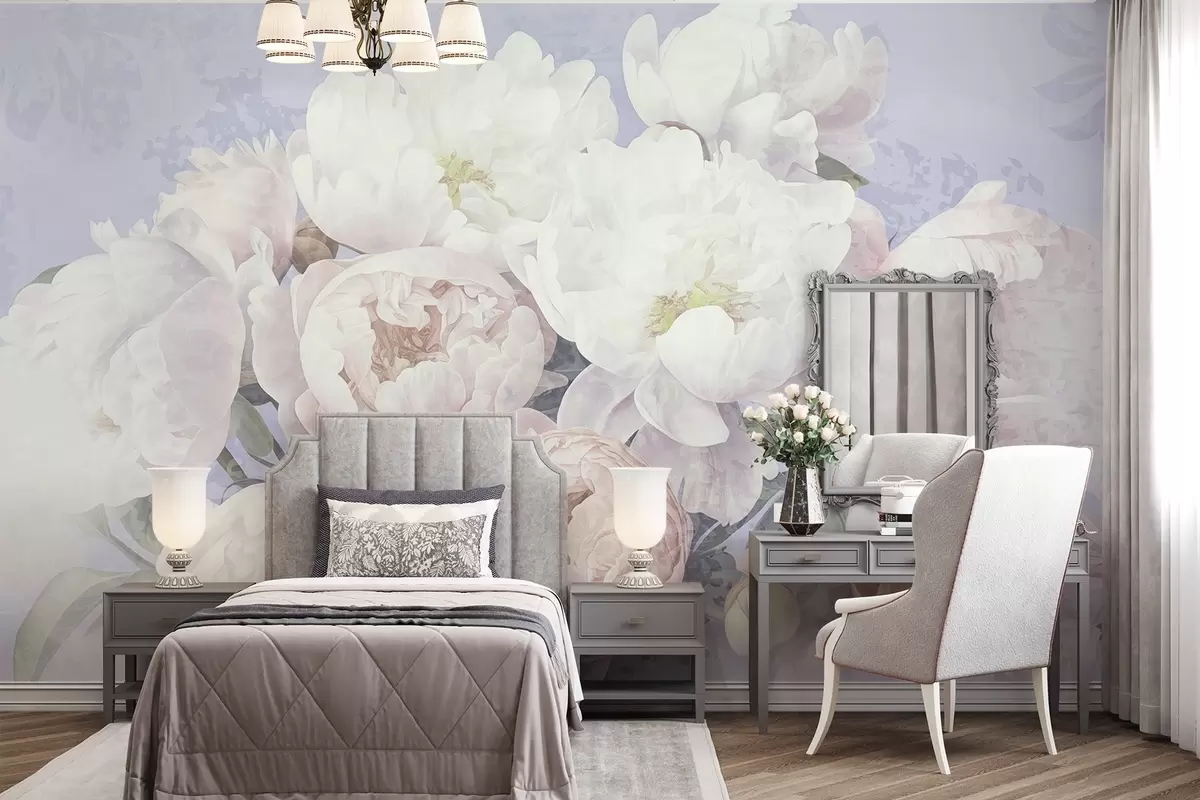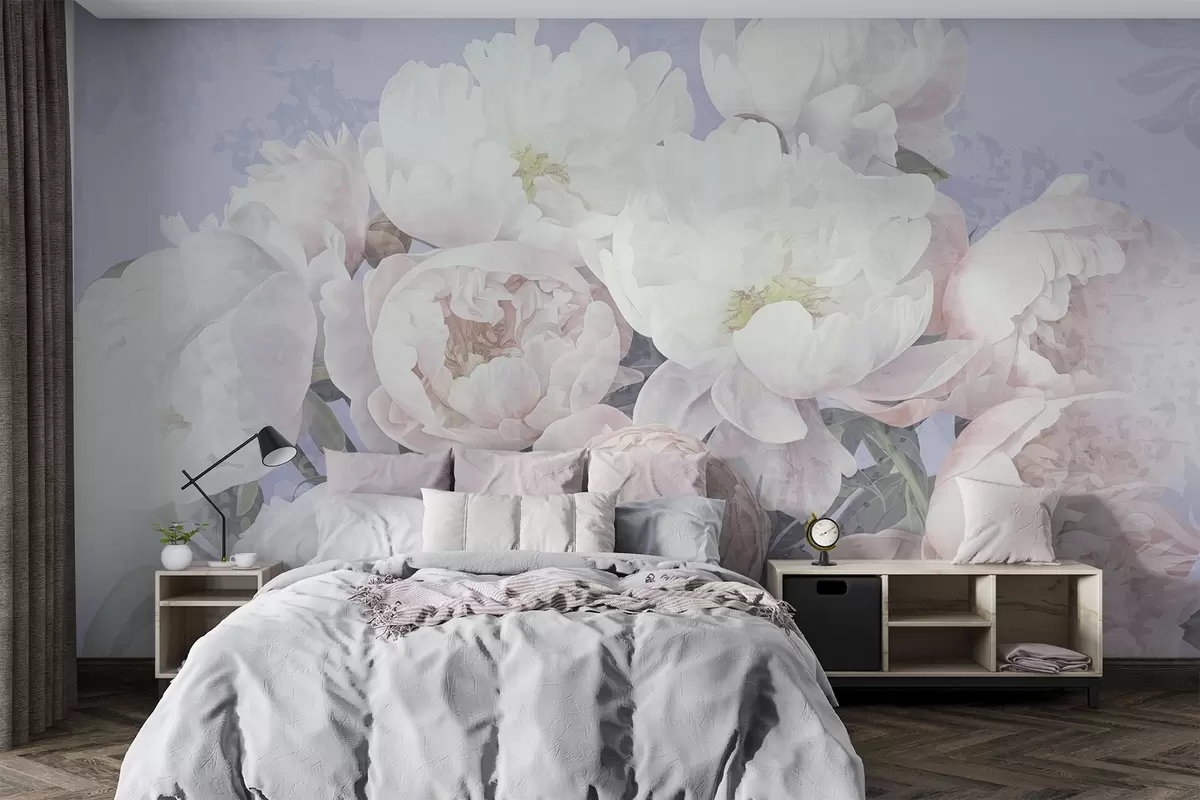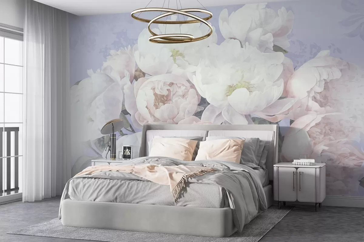 Papel de pared Peonías abstractas en melocotón y blanco con hojas verdes, fondo claro, colores suaves y delicados, estilo vintage Nr. w09008v1