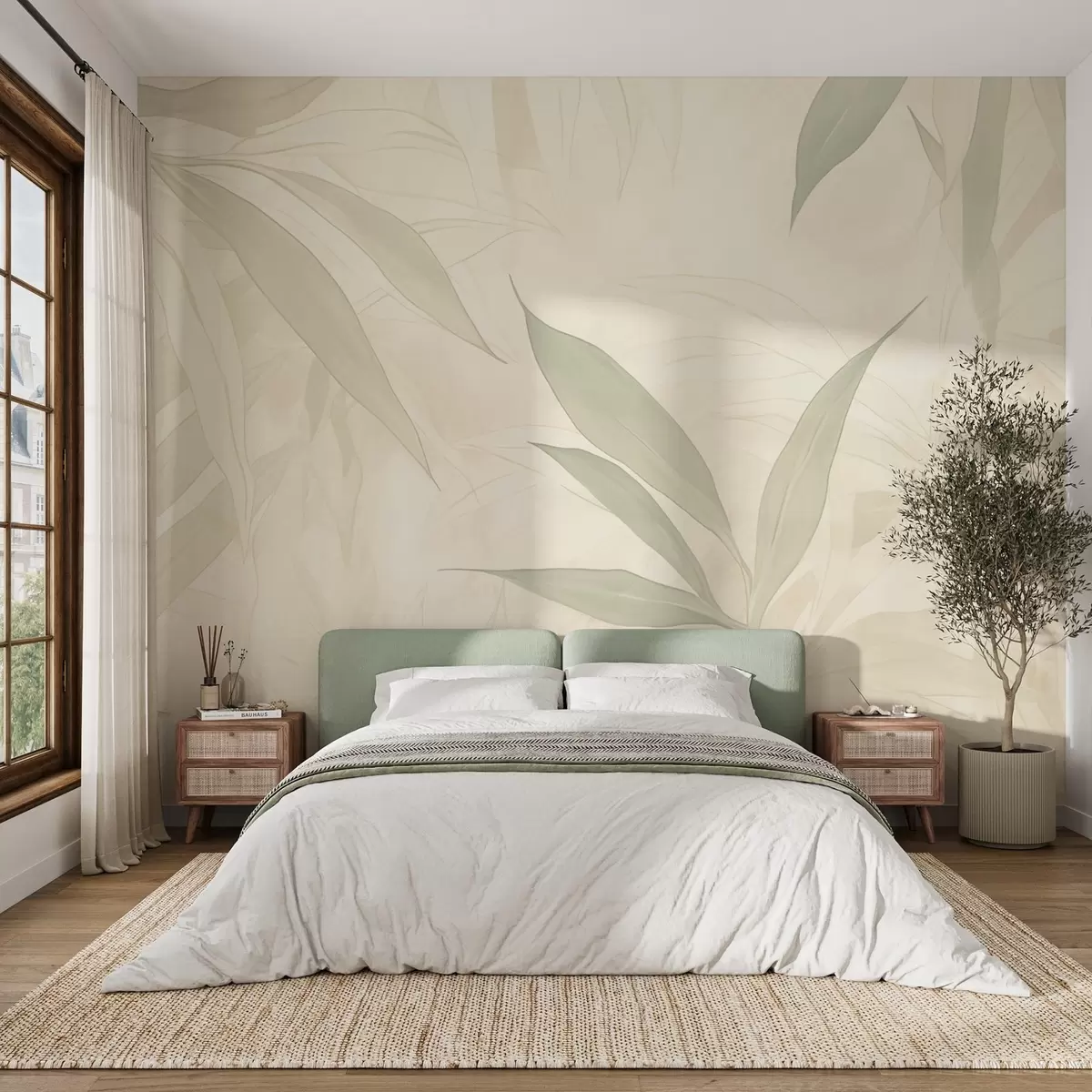 Papel de pared Ramas con hojas en suaves tonos verdes sobre fondo beige Nr. w09027