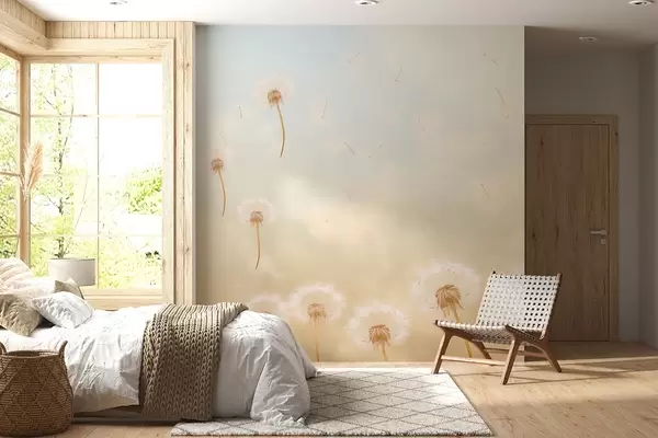 Papel de pared Dientes de león de color beige soplando en el viento contra el cielo Nr. w09028