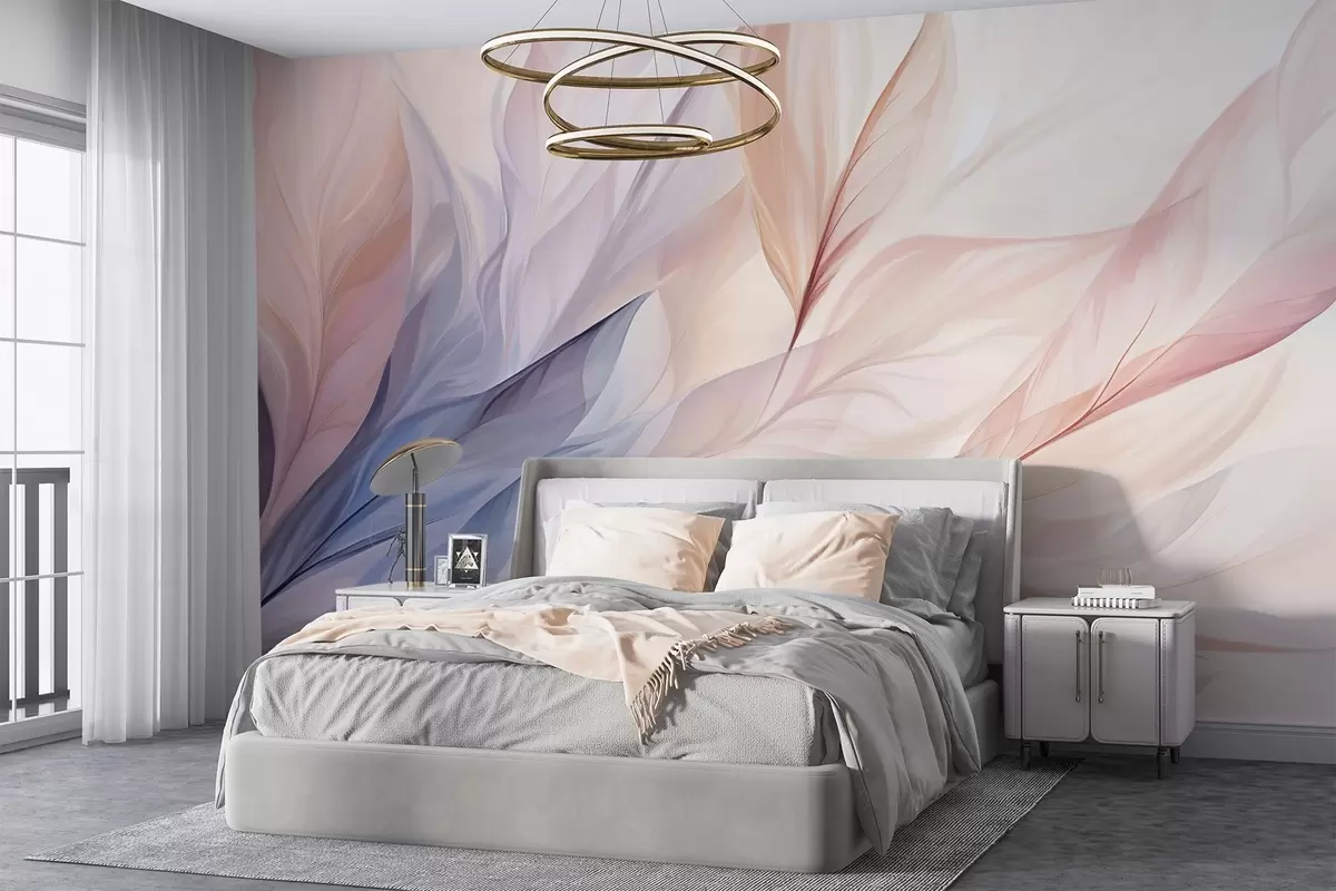 Papel de pared Diseño floral abstracto con pétalos que fluyen en tonos pastel de rosa, melocotón y azul, creando una composición suave y de ensueño Nr. w09049