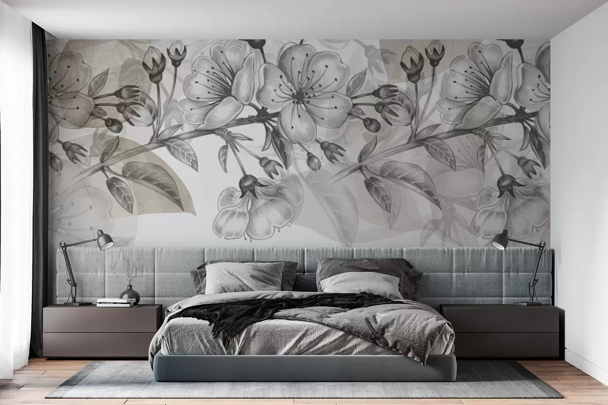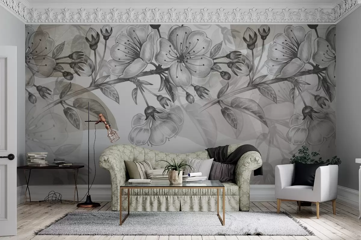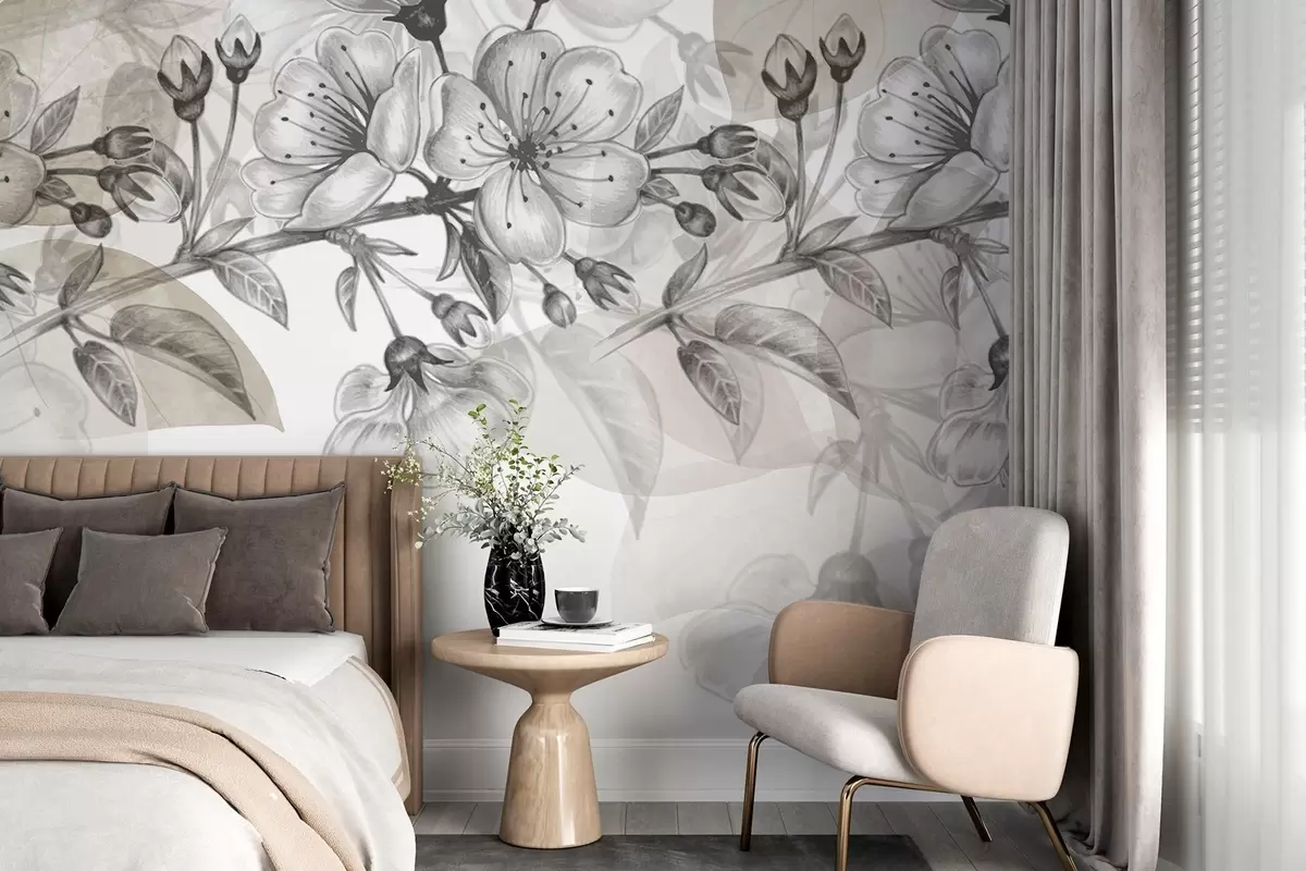 Papel de pared Ramo de cerezo con flores y capullos, tonos sepia, fondo suave tipo acuarela con tonos grises y marrones Nr. w09051v1