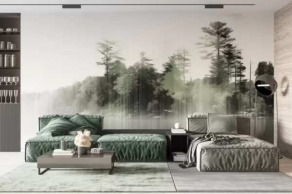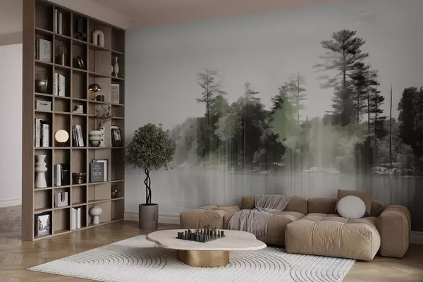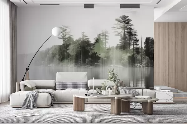 Papel de pared Paisaje abstracto minimalista texturizado con un lago y árboles reflejados en el agua en tonos verdes y blancos Nr. w09058